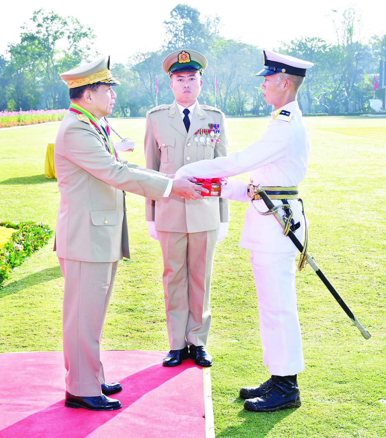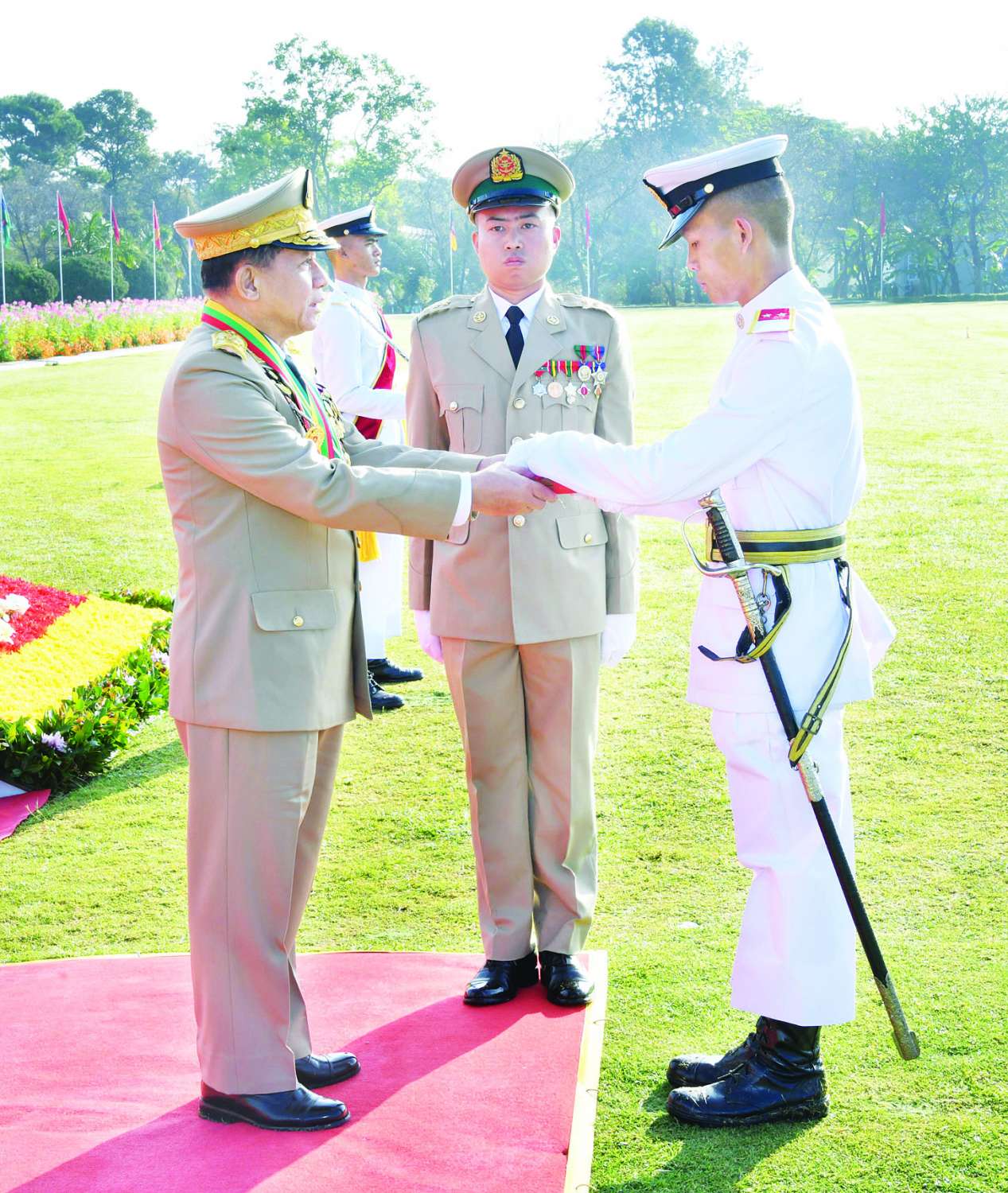 ယင်းနောက် နိုင်ငံတော်စီမံအုပ်ချုပ်ရေးကောင်စီဥက္ကဋ္ဌ တပ်မတော်ကာကွယ်ရေးဦးစီးချုပ် ဗိုလ်ချုပ်မှူးကြီး သတိုးမဟာသရေစည်သူ သတိုးသီရိသုဓမ္မ မင်းအောင်လှိုင်သည် ဗိုလ်လောင်းတပ်ခွဲများ၏ အလေးပြုခြင်းကိုခံယူပြီး စစ်ရေးပြအခမ်းအနားမှ ပြန်လည်ထွက်ခွာသည်။