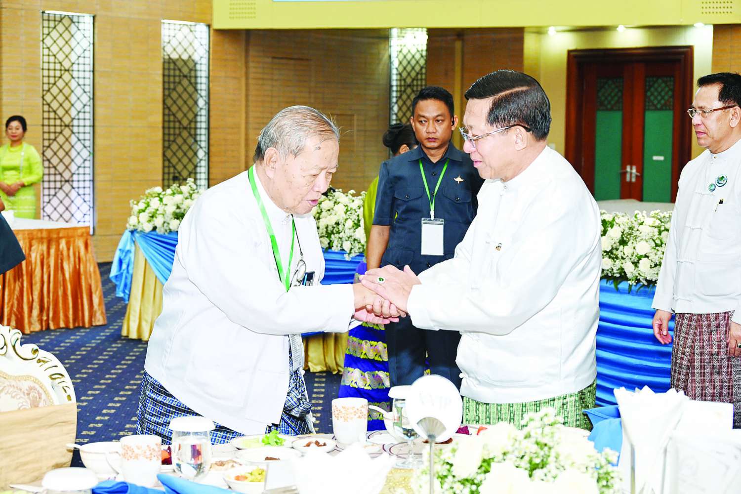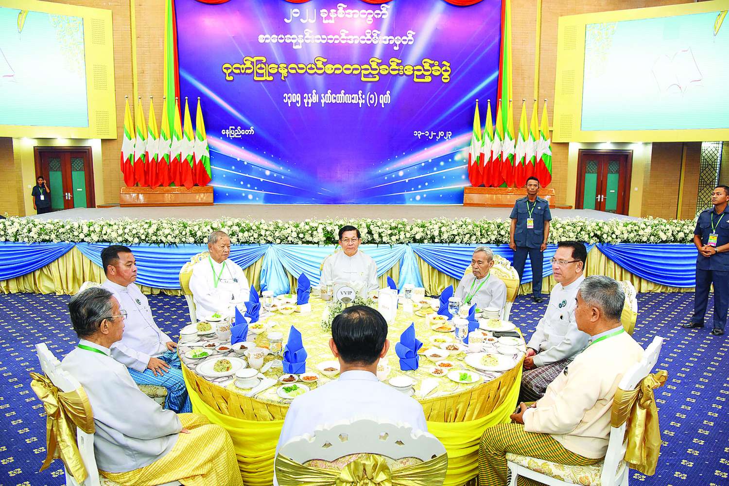 နေလယ်စာ သုံးဆောင်အပြီးတွင် နိုင်ငံတော်စီမံအုပ်ချုပ်ရေးကောင်စီဥက္ကဋ္ဌ နိုင်ငံတော်ဝန်ကြီးချုပ်နှင့် ဇနီးတို့သည် ၂၀၂၂ ခုနှစ်အတွက် အမျိုးသားစာပေ တစ်သက်တာဆု၊ အမျိုးသားစာပေဆုနှင့် စာပေဗိမာန်စာမူဆု ရရှိခဲ့ကြသူများ၊ အနုပညာရှင်များ၊ စာပေပညာရှင်များကို ရင်းရင်းနှီးနှီး နှုတ်ဆက်ခဲ့ကြောင်း သတင်းရရှိသည်။