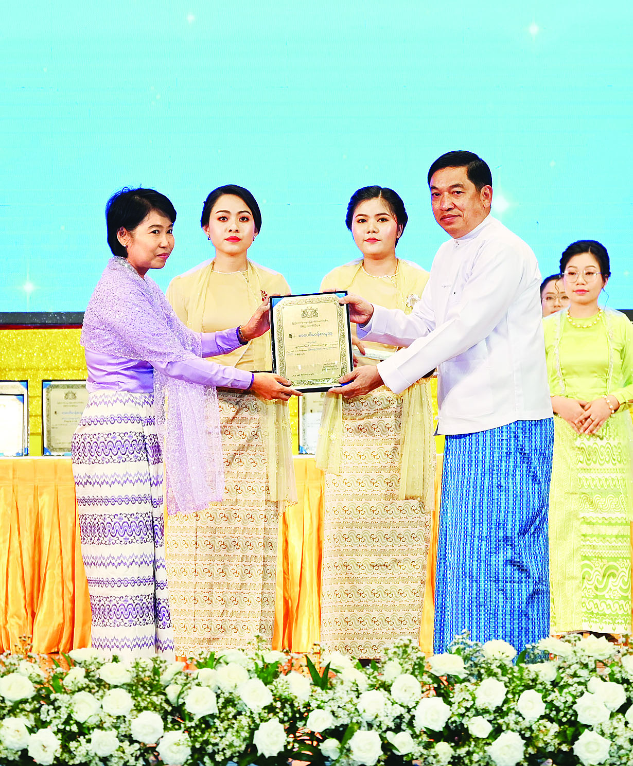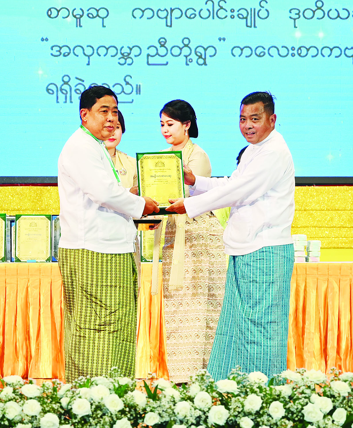 ထို့နောက် ကောင်စီတွဲဖက်အတွင်းရေးမှူး ဒုတိယဗိုလ်ချုပ်ကြီး ရဲဝင်းဦး၊ ကောင်စီဝင်များဖြစ်ကြသည့် ဗိုလ်ချုပ်ကြီး မြထွန်းဦး၊ ဗိုလ်ချုပ်ကြီး တင်အောင်စန်း၊ ဗိုလ်ချုပ်ကြီး မောင်မောင်အေး၊ ဒုတိယဗိုလ်ချုပ်ကြီး ရာပြည့်၊ ဒုတိယဗိုလ်ချုပ်ကြီး ညိုစော၊ ပြည်ထောင်စုဝန်ကြီး ဦးဝင်းရှိန်နှင့် ဦးမောင် မောင်အုန်းတို့က အမျိုးသားစာပေဆု ရရှိသူများနှင့် စာပေဗိမာန်စာမူဆု ရရှိသူများကို ဆုများပေးအပ် ချီးမြှင့်ကြသည်။