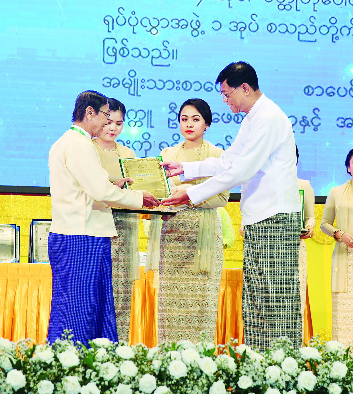 ယင်းနောက် နိုင်ငံတော်စီမံအုပ်ချုပ်ရေးကောင်စီ ဥက္ကဋ္ဌ နိုင်ငံတော်ဝန်ကြီးချုပ်နှင့်ဇနီးတို့က ၂၀၂၂ခုနှစ်၊ အမျိုးသားစာပေတစ်သက်တာဆု ရရှိကြသည့် စာပေပညာရှင်ဆရာကြီး ဒေါက်တာထွန်းတင့် (ဒေါက်တာ ထွန်းတင့်-မြန်မာစာ)၊ စာပေပညာရှင်ဆရာကြီး ဒေါက်တာချစ်စံ (ချစ်စံဝင်း)၊ စာပေပညာရှင် ဆရာမကြီး ဒေါ်ခင်သန်းဝင်း (ကြူကြူသင်း)၊ စာပေပညာရှင် ဆရာကြီး ဒေါက်တာသန်းဦး (ပြည်စိုးမင်း)ကိုယ်စား သန်းဦးဖောင်ဒေးရှင်း အတွင်းရေးမှူး ဦးအေးကြိုင်တို့ကို ဆုတံဆိပ်များ၊ ဂုဏ်ပြုချီးမြှင့်ငွေနှင့် အမှတ်တရဂုဏ်ပြုလက်ဆောင်များ ပေးအပ်ချီးမြှင့်သည်။