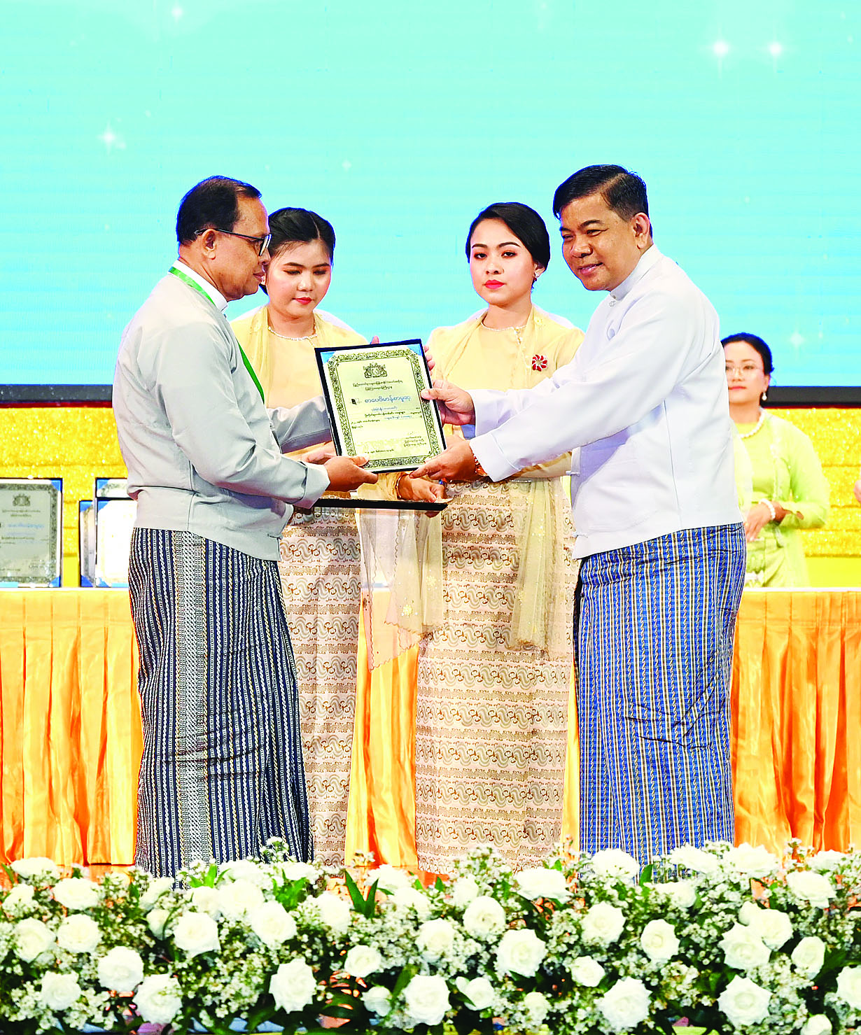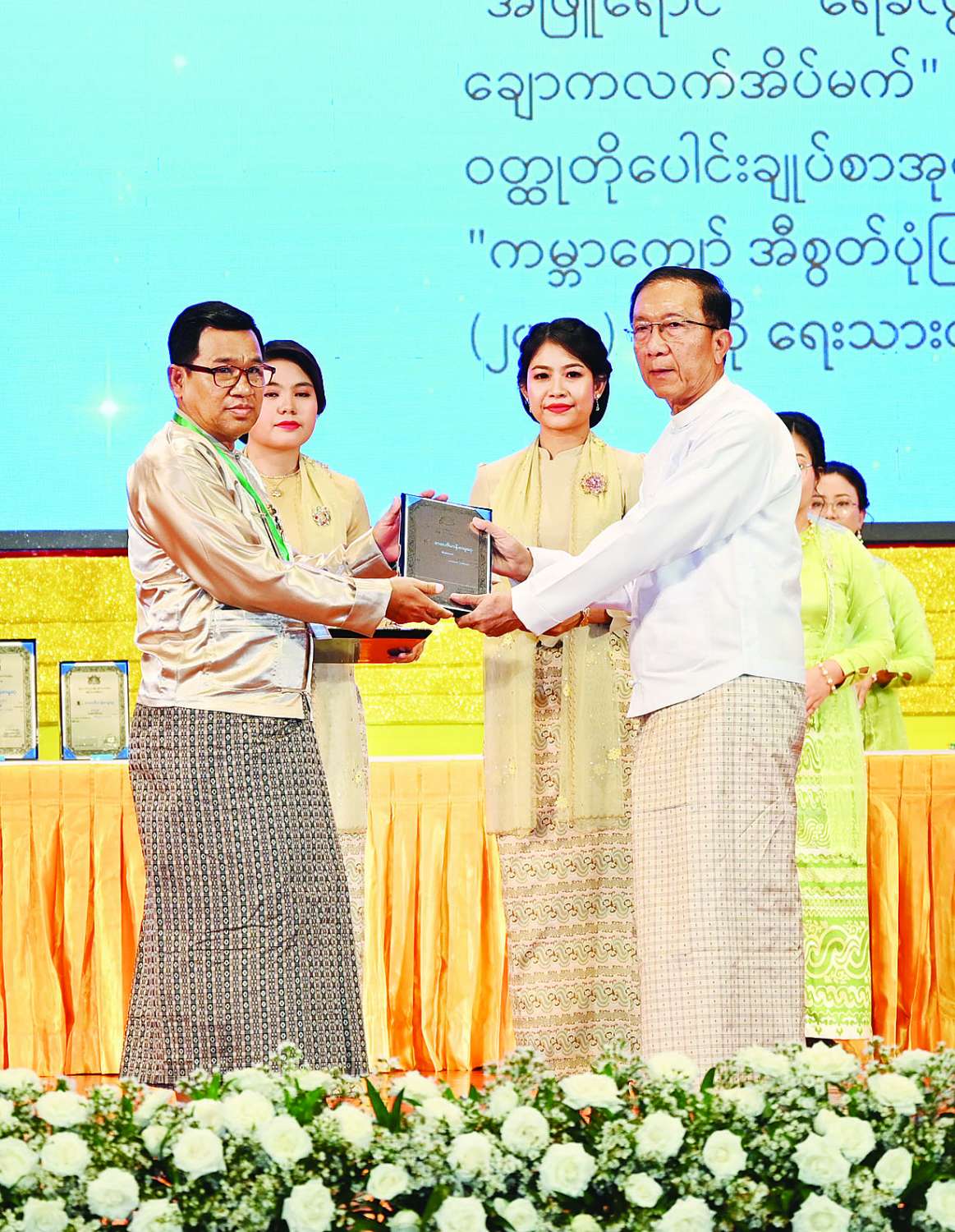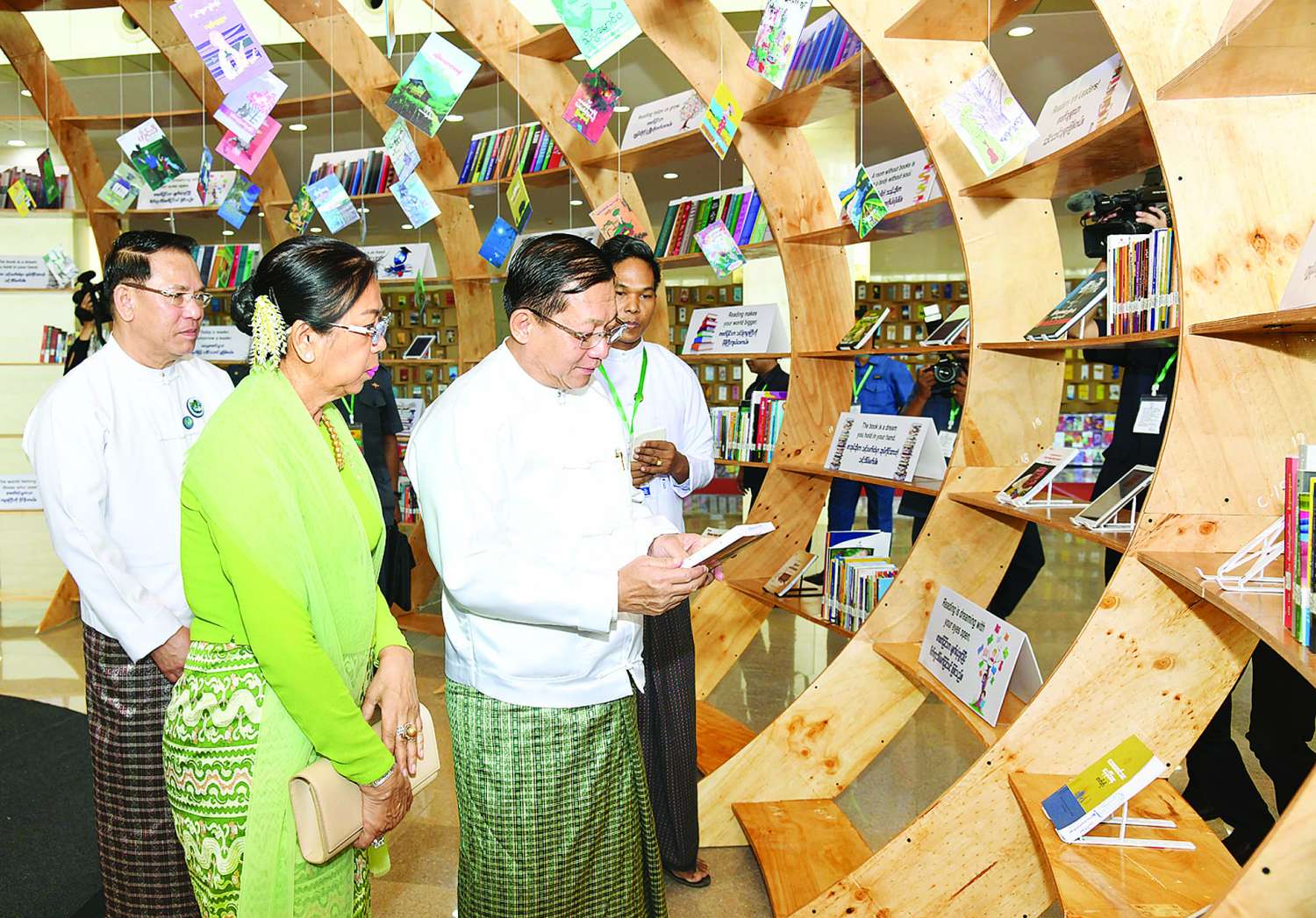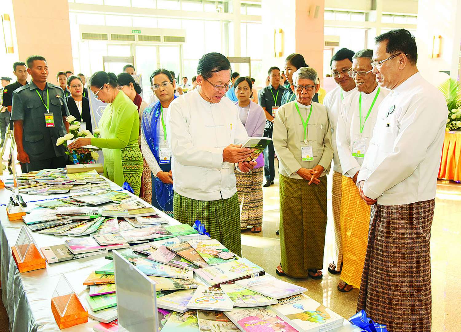 အခမ်းအနားမစတင်မီ နိုင်ငံတော်စီမံအုပ်ချုပ်ရေးကောင်စီဥက္ကဋ္ဌ နိုင်ငံတော်ဝန်ကြီးချုပ်နှင့် အခမ်းအနားတက်ရောက်လာကြသူများသည် မြန်မာအပြည်ပြည်ဆိုင်ရာ ကွန်ဗင်းရှင်း ဗဟိုဌာန-၂ မြေညီထပ်၌ ခင်းကျင်းပြသထားသည့် ဆုရရှိသူများ၏ အတ္ထုပ္ပတ္တိ၊ ဓာတ်ပုံ၊ ဆုရစာအုပ်များနှင့် စာအုပ်စာစောင်များကို လှည့်လည်ကြည့်ရှုကြသည်။