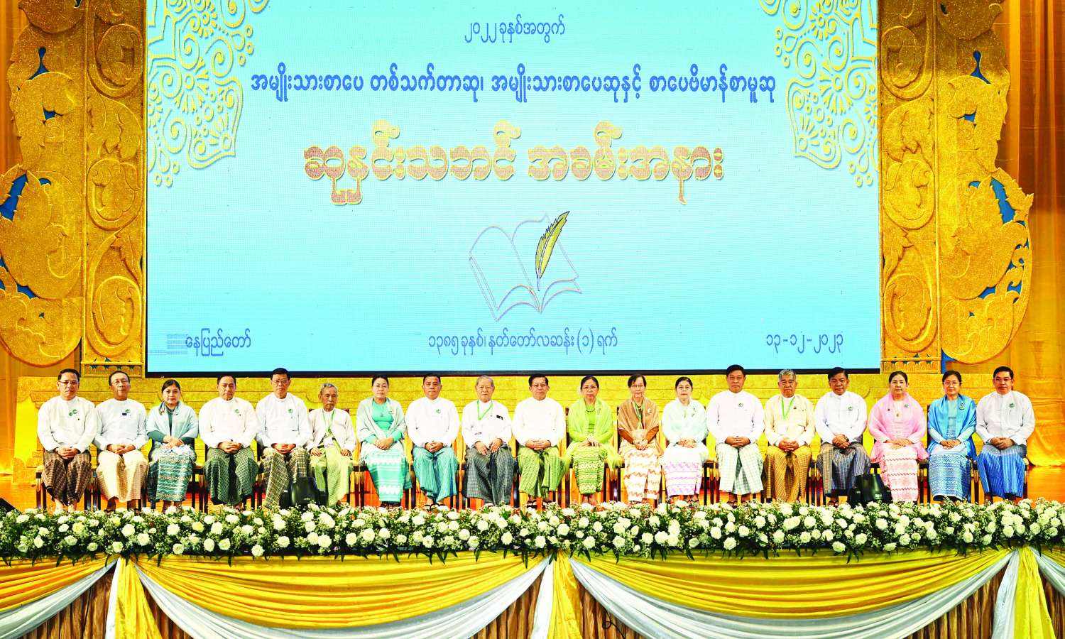 ၂၀၂၂ ခုနှစ်အတွက် အမျိုးသားစာပေတစ်သက်တာဆု၊ အမျိုးသားစာပေဆုနှင့်စာပေဗိမာန်စာမူဆု ဆုနှင်းသဘင်အခမ်းအနားကို ယနေ့နံနက်ပိုင်းတွင်နေပြည်တော်ရှိ အပြည်ပြည်ဆိုင်ရာကွန်ဗင်းရှင်းဗဟိုဌာန-၂ ၌ ကျင်းပပြုလုပ်ရာ နိုင်ငံတော်စီမံအုပ်ချုပ်ရေးကောင်စီဥက္ကဋ္ဌ နိုင်ငံတော်ဝန်ကြီးချုပ် ဗိုလ်ချုပ်မှူးကြီးမင်းအောင်လှိုင်နှင့်ဇနီးဒေါ်ကြူကြူလှတို့ တက်ရောက်၍ စာပေဆုများ ပေးအပ်ချီးမြှင့်သည်။