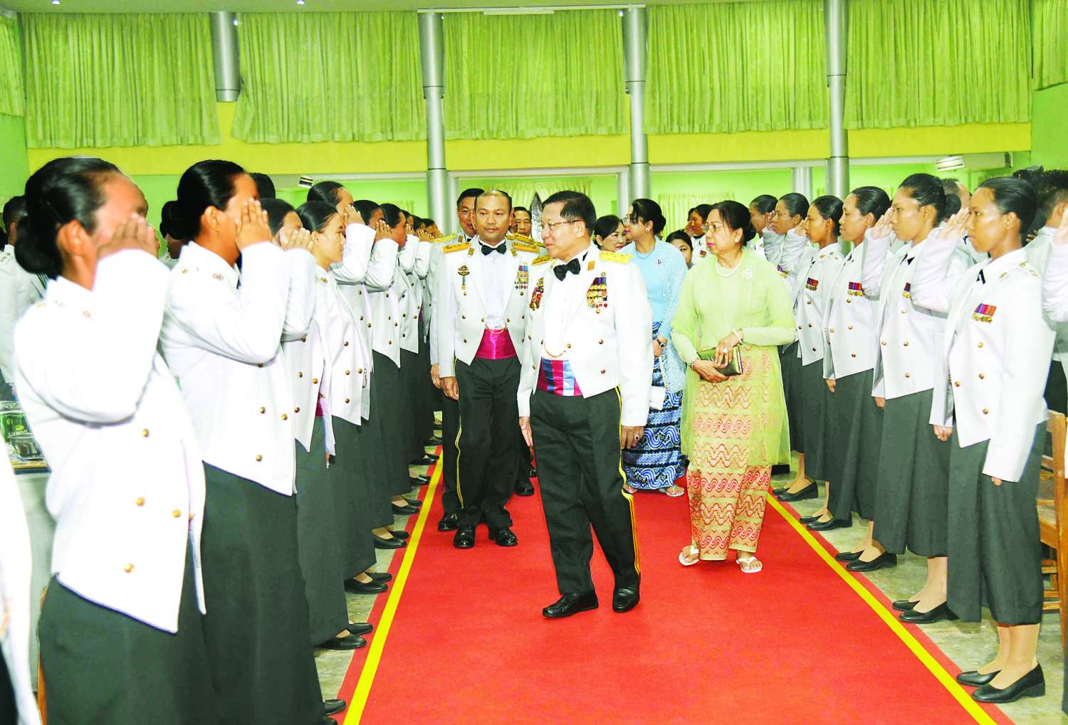 ဦးစွာ နိုင်ငံတော်စီမံအုပ်ချုပ်ရေးကောင်စီဥက္ကဋ္ဌ တပ်မတော်ကာကွယ်ရေးဦးစီးချုပ်က သင်တန်းဆင်းအမျိုးသမီးအရာရှိများကို တစ်ဦးချင်း ရင်းရင်းနှီးနှီးလိုက်လံနှုတ်ဆက်သည်။ ထို့နောက် နိုင်ငံတော်စီမံအုပ်ချုပ်ရေးကောင်စီဥက္ကဋ္ဌ တပ်မတော်ကာကွယ်ရေးဦးစီးချုပ်နှင့် အဖွဲ့ဝင်များသည် သင်တန်းဆင်းအမျိုးသမီးအရာရှိများ၊ ညစာစားပွဲ တက်ရောက်လာကြသူများနှင့်အတူ ဂုဏ်ပြုညစာကို အတူတကွ သုံးဆောင်ကြသည်။