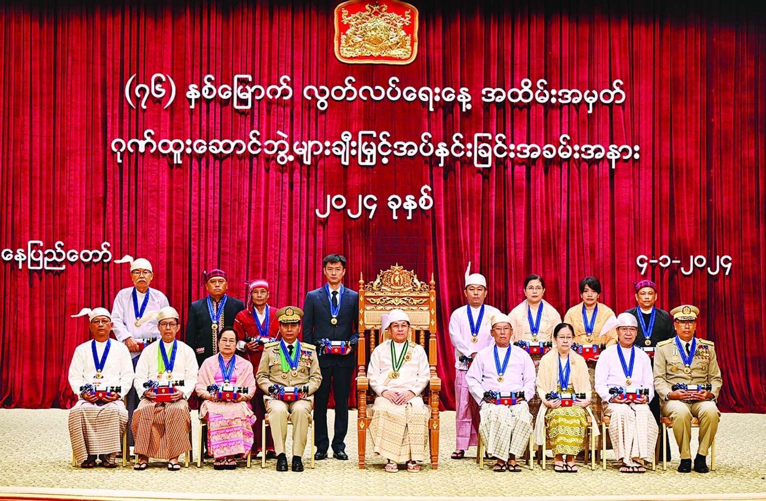 (၇၆)နှစ်မြောက်လွတ်လပ်ရေးနေ့အထိမ်းအမှတ် ဂုဏ်ထူးဆောင်ဘွဲ့များ ချီးမြှင့်အပ်နှင်းခြင်းအခမ်းအနားကို နိုင်ငံတော်စီမံအုပ်ချုပ်ရေးကောင်စီဥက္ကဋ္ဌရုံး သဘင်ဆောင်၌ ယနေ့နံနက်ပိုင်းတွင်ကျင်းပရာ နိုင်ငံတော်စီမံအုပ်ချုပ်ရေးကောင်စီဥက္ကဋ္ဌ နိုင်ငံတော်ဝန်ကြီးချုပ် ဗိုလ်ချုပ်မှူးကြီး သတိုးမဟာသရေစည်သူ သတိုးသီရိသုဓမ္မမင်းအောင်လှိုင် တက်ရောက်အမှာစကားပြောကြားပြီး ဂုဏ်ထူးဆောင်ဘွဲ့များ ချီးမြှင့်အပ်နှင်းသည်။
