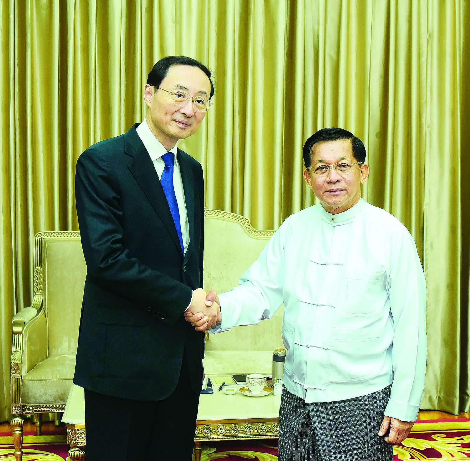 တွေ့ဆုံပွဲအပြီးတွင် နိုင်ငံတော်စီမံအုပ်ချုပ်ရေးကောင်စီဥက္ကဋ္ဌ နိုင်ငံတော်ဝန်ကြီးချုပ်နှင့် တရုတ်နိုင်ငံ နိုင်ငံခြားရေးဝန်ကြီးဌာန ဒုတိယဝန်ကြီး Mr. Sun Weidong တို့သည် အမှတ်တရလက်ဆောင်ပစ္စည်းများ အပြန်အလှန်ပေးအပ်ကြပြီး မှတ်တမ်းတင်ဓာတ်ပုံရိုက်ခဲ့ကြကြောင်း သတင်းရရှိသည်။