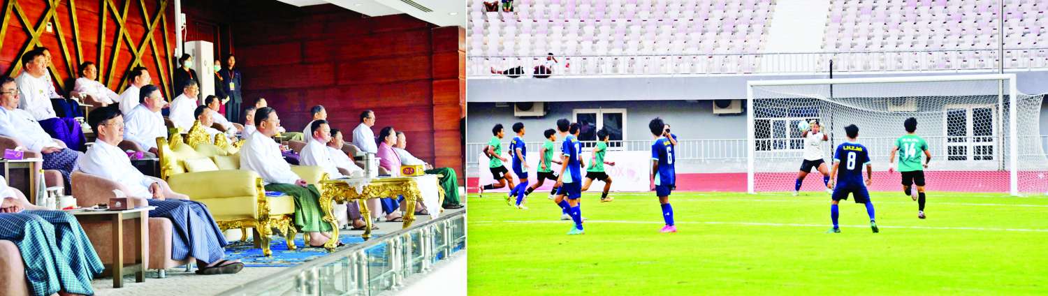 ဦးစွာ နိုင်ငံတော်စီမံအုပ်ချုပ်ရေးကောင်စီဥက္ကဋ္ဌ နိုင်ငံတော်ဝန်ကြီးချုပ်နှင့် တက်ရောက်လာကြသူများသည် ၂၀၂၃-၂၀၂၄ ပညာသင်နှစ်၊ ပညာရေးဝန်ကြီးဌာန တက္ကသိုလ်ပေါင်းစုံဘောလုံးပြိုင်ပွဲ၏ နောက်ဆုံးဗိုလ်လုပွဲအဖြစ် မော်လမြိုင်ဇုန်အသင်းနှင့် မြစ်ကြီးနားဇုန်အသင်းတို့ ယှဉ်ပြိုင်ကစားမှုကို ကြည့်ရှုအားပေးသည်။