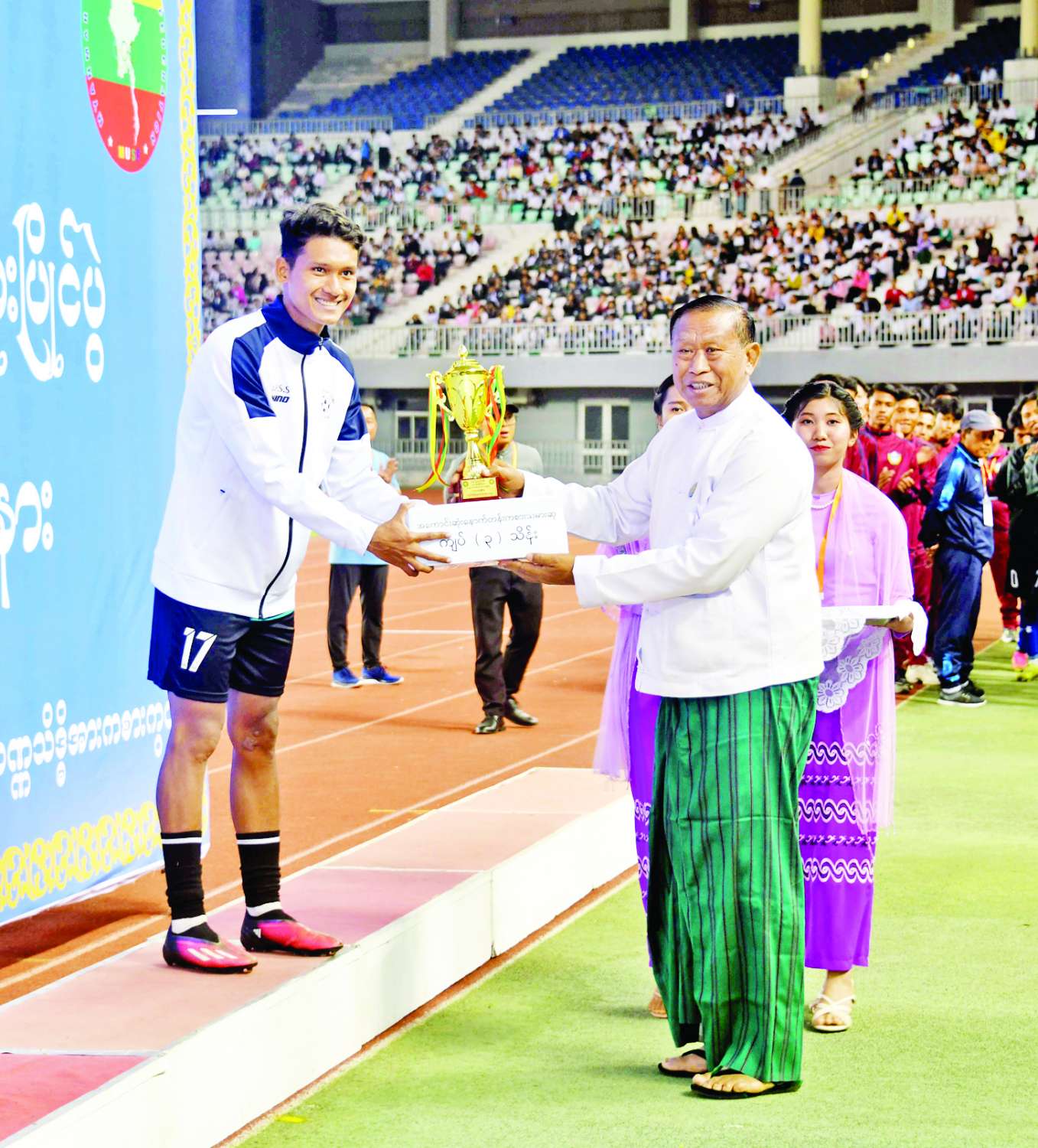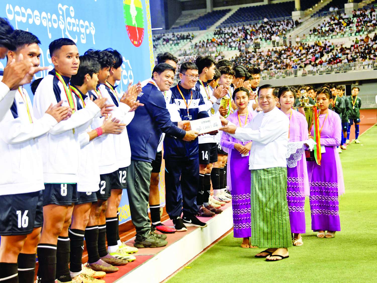 ယင်းနောက် နိုင်ငံတော်စီမံအုပ်ချုပ်ရေးကောင်စီဥက္ကဋ္ဌ နိုင်ငံတော်ဝန်ကြီးချုပ် ဗိုလ်ချုပ်မှူးကြီး မင်းအောင်လှိုင်က ပထမဆုရရှိသည့် မော်လမြိုင်ဇုန်အသင်းအား ဂုဏ်ပြုဆုငွေများနှင့် တံခွန်စိုက်ဆုဖလားကို ပေးအပ်ချီးမြှင့်သည်။