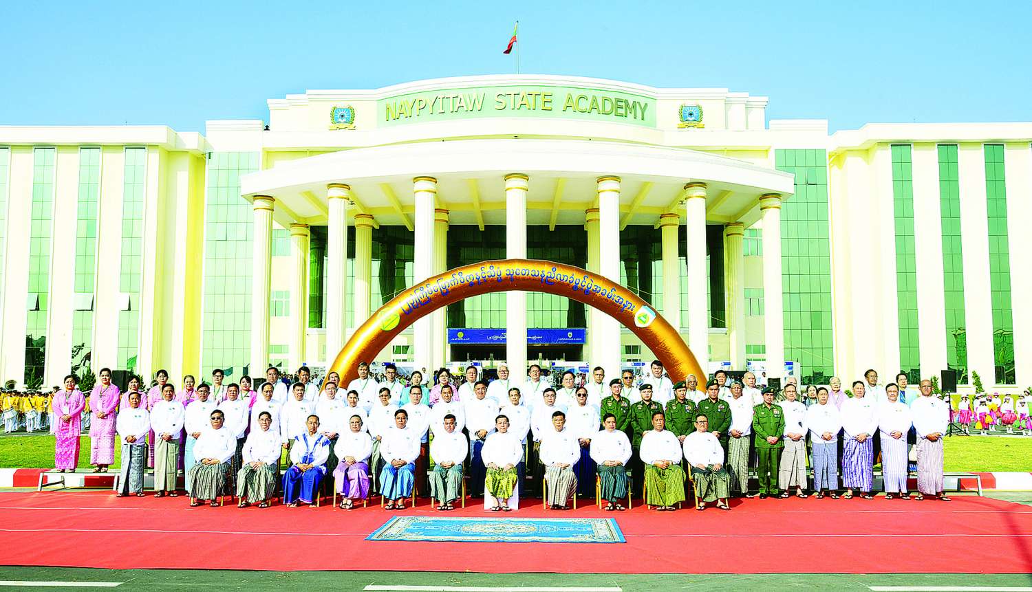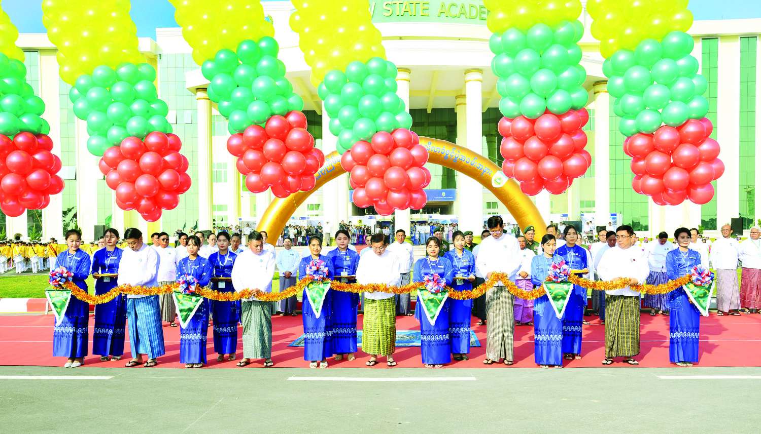 ဦးစွာ နိုင်ငံတော်စီမံအုပ်ချုပ်ရေးကောင်စီဥက္ကဋ္ဌ နိုင်ငံတော်ဝန်ကြီးချုပ်နှင့် အဖွဲ့ဝင်များသည် အခမ်းအနားကျင်းပမည့်နေရာသို့ ရောက်ရှိကြရာ ဆရာ၊ ဆရာမများ၊ ကျောင်းသား၊ ကျောင်းသူများနှင့် တာဝန်ရှိသူများက လှိုက်လှဲနွေးထွေးစွာ ကြိုဆိုနှုတ်ဆက်ကြသည်။