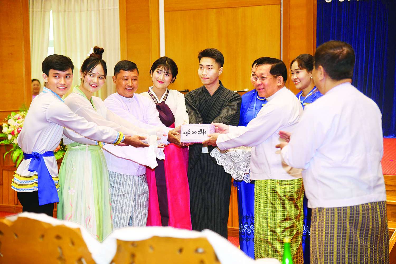 ယင်းနောက် နိုင်ငံတော်စီမံအုပ်ချုပ်ရေးကောင်စီဥက္ကဋ္ဌ နိုင်ငံတော်ဝန်ကြီးချုပ်နှင့် အဖွဲ့ဝင်များ၊ တက်ရောက်လာကြသူများသည် မန္တလေးနိုင်ငံခြားဘာသာတက္ကသိုလ်မှ ကျောင်းသား၊ ကျောင်းသူများ၏ ရုရှား၊ တရုတ်၊ ကိုရီးယား၊ ဂျပန်ရိုးရာအကများဖြင့် ဖျော်ဖြေတင်ဆက်မှုကို ကြည့်ရှုအားပေးကြသည်။