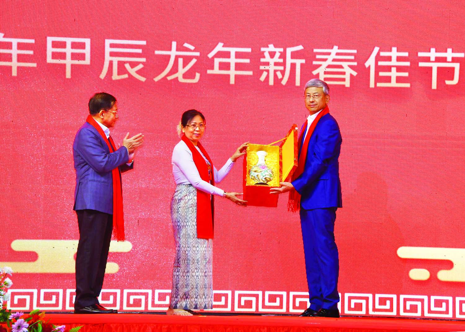 ယင်းနောက် နိုင်ငံတော်စီမံအုပ်ချုပ်ရေးကောင်စီဥက္ကဋ္ဌ နိုင်ငံတော်ဝန်ကြီးချုပ်နှင့် ဇနီး၊ မြန်မာနိုင်ငံဆိုင်ရာ တရုတ်နိုင်ငံ သံအမတ်ကြီးတို့သည် ၂၀၂၄ ခုနှစ် ရွှေနဂါးတရုတ်နှစ်သစ်ကူး အထိမ်းအမှတ်လက်ဆောင်များကို အပြန်အလှန် ပေးအပ်ကြသည်။