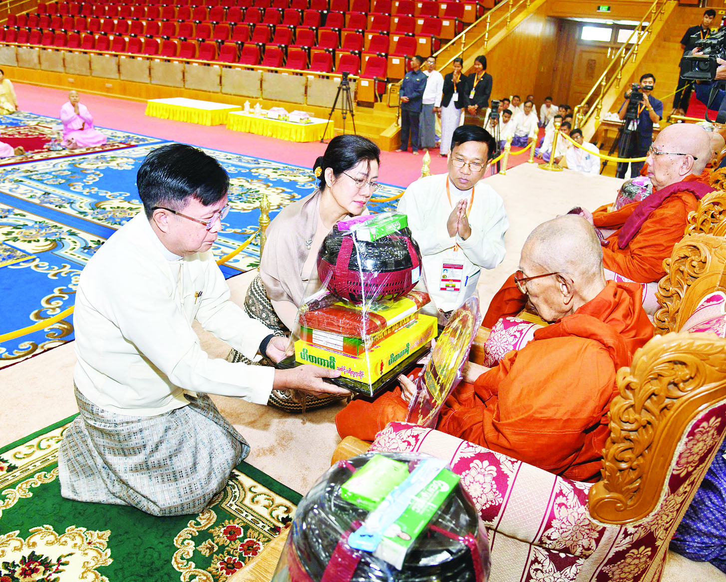 ယင်းနောက် နိုင်ငံတော်စီမံအုပ်ချုပ်ရေးကောင်စီဥက္ကဋ္ဌ နိုင်ငံတော်ဝန်ကြီးချုပ်နှင့် ဇနီးတို့က နိုင်ငံတော်သံဃမဟာနာယက အဖွဲ့ဥက္ကဋ္ဌ သန်လျင်မင်းကျောင်းဆရာတော် ဘုရားကြီးထံသို့လည်းကောင်း၊ ကောင်စီဒုတိယဥက္ကဋ္ဌ ဒုတိယဝန်ကြီးချုပ်နှင့် ဇနီးတို့က နိုင်ငံတော်သံဃမဟာ နာယကအဖွဲ့ အကျိုးတော်ဆောင်၊ မန္တလေးမြို့၊ မစိုးရိမ်တိုက်သစ် မဟာနာယက ဆရာတော်ကြီးထံသို့လည်းကောင်း၊ ကောင်စီ အတွင်းရေးမှူးနှင့် ဇနီး၊ တွဲဖက်အတွင်းရေးမှူးနှင့် ဇနီး၊ ကောင်စီအဖွဲ့ဝင်များနှင့်ဇနီးများ၊ အခမ်းအနားသို့ တက်ရောက်လာသည့် အကြီးအကဲများက သာသနာတော်ဆိုင်ရာ ဘွဲ့တံဆိပ်တော်ဆက်ကပ်ခံယူမည့် ဆရာတော်ကြီးများထံသို့လည်းကောင်း လှူဖွယ်ဝတ္ထုပစ္စည်းများကို ဆက်ကပ်လှူဒါန်းကြသည်။