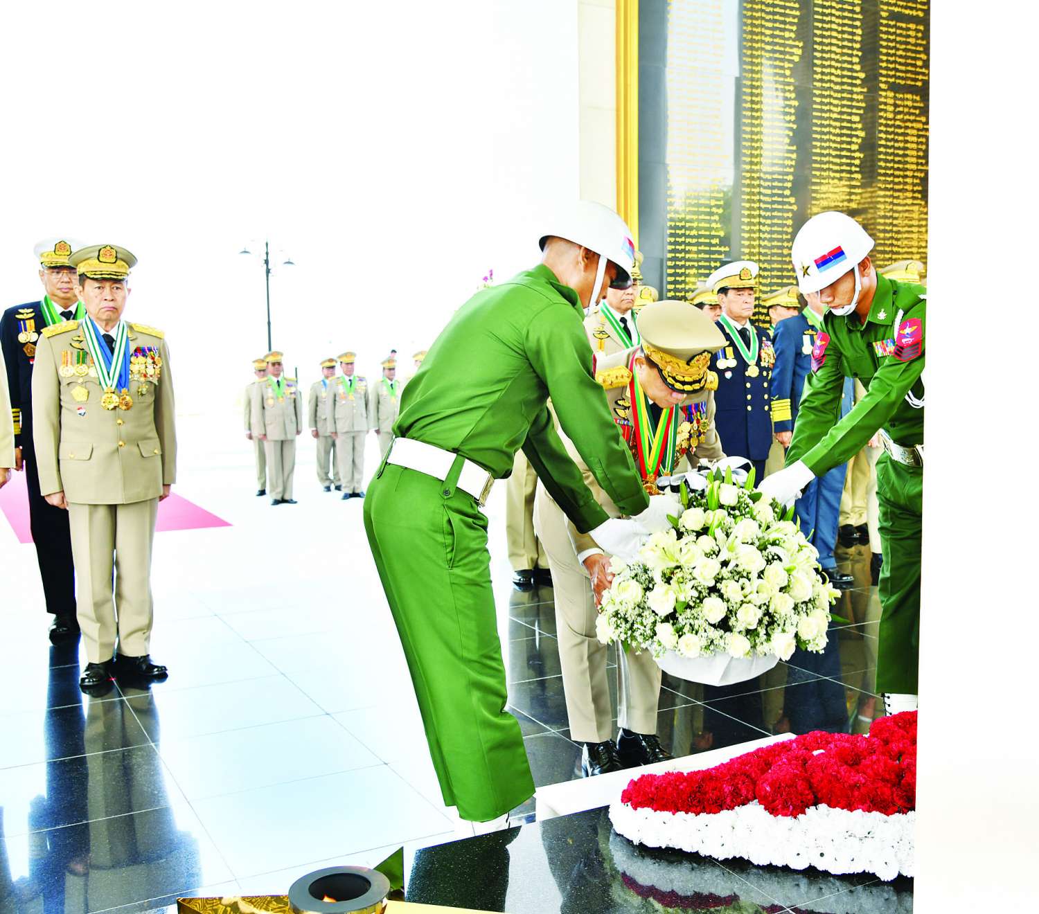 နိုင်ငံတော်စီမံအုပ်ချုပ်ရေးကောင်စီဥက္ကဋ္ဌ တပ်မတော်ကာကွယ်ရေးဦးစီးချုပ် ဗိုလ်ချုပ်မှူးကြီး သတိုးမဟာသရေစည်သူ သတိုးသီရိသုဓမ္မ မင်းအောင်လှိုင်နှင့် တပ်မတော်အရာရှိကြီးများ သူရဲကောင်းဗိမာန် (နေပြည်တော်) ၌ ဂုဏ်ပြုပန်းခြင်းချအလေးပြု