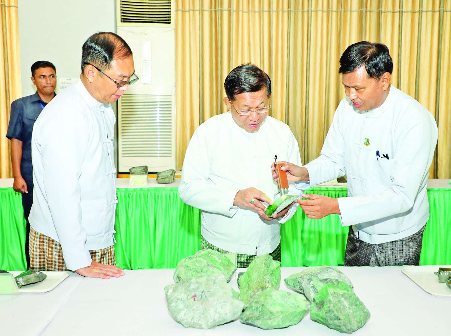 ထို့နောက် နိုင်ငံတော်စီမံအုပ်ချုပ်ရေးကောင်စီဥက္ကဋ္ဌ နိုင်ငံတော်ဝန်ကြီးချုပ်နှင့်အဖွဲ့ဝင်များသည် ပုဂ္ဂလိကကျောက်မျက်ရတနာအချောထည် အရောင်းပြခန်းများ ဖွင့်လှစ်ရောင်းချနေမှုကို လိုက်လံကြည့်ရှုအားပေးပြီး ခန်းမအပြင်ဘက်တွင် ခင်းကျင်းပြသထားသည့် ကျောက်စိမ်းရိုင်းအတွဲများကို လိုက်လံကြည့်ရှု စစ်ဆေးသည်။