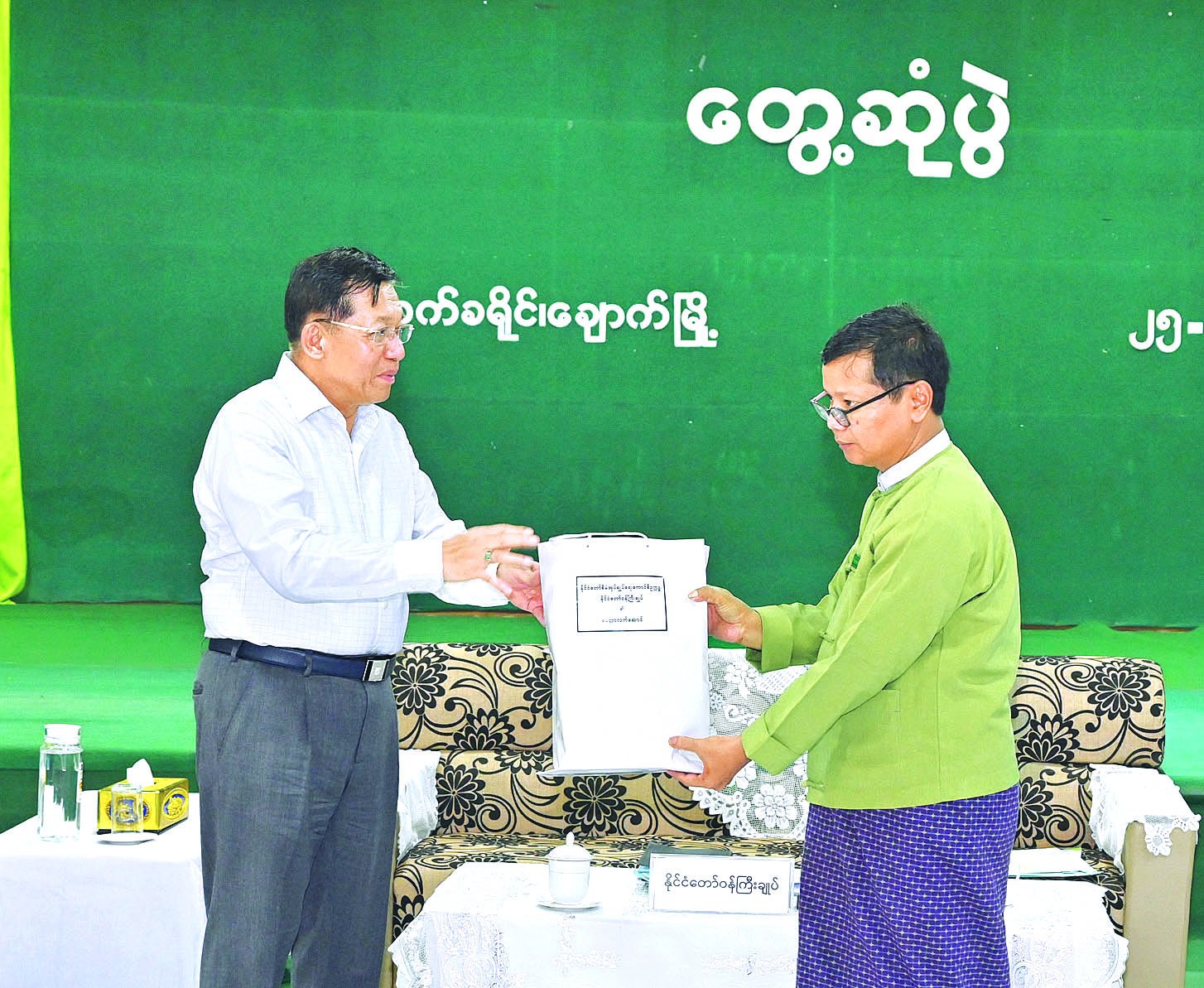 ဦးစွာ ချောက်ခရိုင်၊ ခေတ္တခရိုင်အုပ်ချုပ်ရေးမှူး ဦးကျော်စိုးက ဒေသဆိုင်ရာ အချက်အလက်များ၊ စိုက်ပျိုးမွေးမြူရေးလုပ်ငန်းများဆောင်ရွက်လျက်ရှိ မှုအခြေအနေများ၊ နွေရာသီကာလတွင် အပူရှောင်နိုင်ရေးအတွက် အပူရှောင်စခန်းများ ဆောင်ရွက်ထားရှိမှုနှင့် ထပ်မံတည်ဆောက်နိုင်ရေး လျာထားဆောင်ရွက်လျက်ရှိမှု အခြေအနေများ၊ မြို့မိမြို့ဖများက ကျန်းမာရေးဆိုင်ရာလိုအပ်ချက်များအား ဖြည့်ဆည်းပေးစေလိုမှု၊ အပူဒဏ်ကိုပြင်းထန်စွာခံစားရသည့်ဒေသဖြစ်သဖြင့် သစ်ပင်သစ်တောစိုက်ပျိုးခြင်း များကိုအောင်မြင်စွာဆောင်ရွက်ပေးစေလိုမှု၊ သောက်သုံးရေအခက်အခဲရှိမှု၊ မြို့တွင်းယာဉ်ကြောပိတ်ဆို့မှုများဖြစ်ပေါ်လာသည့်အတွက် ကုန်တင်ကားကြီးရပ်နားဝင်းကို အမြန်ဆုံးဖော်ဆောင်ပေးစေလိုမှု၊ ဒေသဖွံ့ဖြိုးတိုးတက်ရေးအတွက်လိုအပ်ချက်များ၊ ရေနံလုပ်ငန်းဧရိယာအတွင်း ကျူးကျော်နေထိုင်သူများကို ဥပဒေနှင့်အညီဆောင်ရွက် ပေးစေလိုမှုနှင့် အခြားလိုအပ်သည်များကို အသီးသီးတင်ပြ ဆွေးနွေးကြသည်။