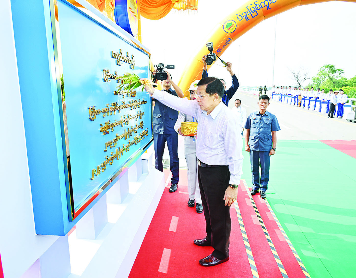 ထို့နောက် နိုင်ငံတော်စီမံအုပ်ချုပ်ရေးကောင်စီဥက္ကဋ္ဌ နိုင်ငံတော်ဝန်ကြီးချုပ်သည် တံတားတည်ဆောက်ရေးတွင်ပါဝင်ခဲ့ကြသည့် တည်ဆောက်ရေးအင်ဂျင်နီယာအဖွဲ့အား သစ်သီးခြင်းနှင့် လက်ဆောင်ပစ္စည်းများပေးအပ်သည်။