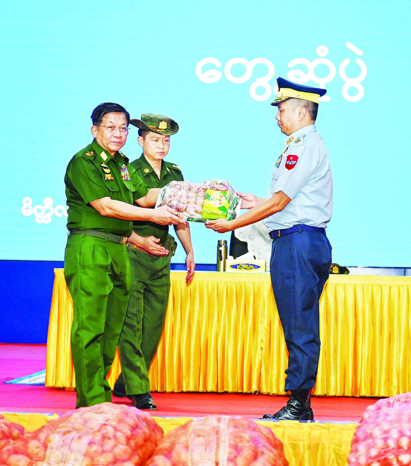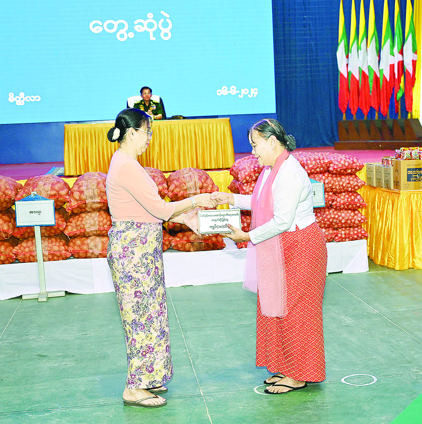 ထို့နောက် နိုင်ငံတော်စီမံအုပ်ချုပ်ရေးကောင်စီဥက္ကဋ္ဌ တပ်မတော်ကာကွယ်ရေးဦးစီးချုပ်က မိတ္ထီလာတပ်နယ်မှ အရာရှိ၊ စစ်သည်၊ မိသားစုများအတွက် စားသောက် ဖွယ်ရာပစ္စည်းများကို ပေးအပ်ရာ တပ်နယ်မှူးကလည်းကောင်း၊ နိုင်ငံတော်စီမံအုပ်ချုပ်ရေးကောင်စီဥက္ကဋ္ဌ တပ်မတော်ကာကွယ်ရေးဦးစီးချုပ်၏ဇနီးက တပ်နယ်မိခင်နှင့် ကလေးစောင့်ရှောက်ရေးအသင်းအတွက် ချီးမြှင့်ငွေများကိုပေးအပ်ရာ တပ်နယ်မှူး၏ ဇနီးက လည်းကောင်း အသီးသီးလက်ခံရယူကြသည်။