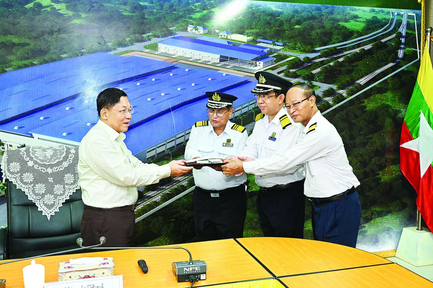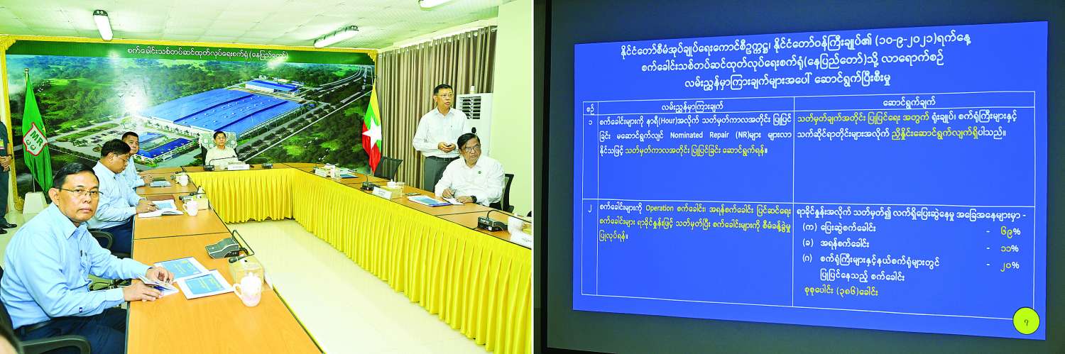 ယင်းနောက် စက်ရုံအစည်းအဝေးခန်းမတွင် ဒုတိယဝန်ကြီးချုပ်နှင့် ပို့ဆောင်ရေးနှင့်ဆက်သွယ်ရေးဝန်ကြီးဌာန ပြည်ထောင်စုဝန်ကြီး ဗိုလ်ချုပ်ကြီးမြထွန်းဦးနှင့် ဒုတိယဝန်ကြီး ဦးအောင်မြိုင်တို့က စက်ရုံသမိုင်းအကျဉ်းနှင့် လုပ်ငန်းတာဝန်များ၊ နိုင်ငံတော်စီမံအုပ်ချုပ်ရေးကောင်စီဥက္ကဋ္ဌ နိုင်ငံတော်ဝန်ကြီးချုပ်၏ ၂၀၂၁ ခုနှစ် စက်တင်ဘာလ ၁၀ ရက်နေ့၌ လာရောက်စစ်ဆေးစဉ် လမ်းညွှန်မှာကြားချက်များအပေါ် လိုက်နာဆောင်ရွက်လျက်ရှိမှုအခြေအနေများ၊ မြစ်ငယ်စက်ရုံတွင် လူစီးတွဲများအား DEMU အဖြစ် သုတေသနပြုတည်ဆောက်ခြင်းလုပ်ငန်းအား အဆင့်ဆင့်ဆောင်ရွက်ခဲ့မှုနှင့် နေပြည်တော်စက်ရုံ၌ အပြီးသတ်တည်ဆောက်ရန် လိုအပ်သည့်စက်အစိတ်အပိုင်းများအလိုက် တည်ဆောက်မှုများကို ဆက်လက်တည်ဆောက်ဆောင်ရွက်လျက်ရှိမှု၊ DEMU ရထားတွဲများ တည်ဆောက်ရန် လိုအပ်သည့်ဘိုဂီများရရှိရေးအတွက် ဆောင်ရွက်လျက်ရှိမှုအခြေအနေများအား Power Point ဖြင့် အသီးသီးရှင်းလင်းတင်ပြကြသည်။
