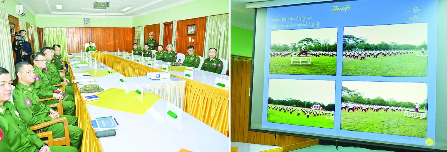 နိုင်ငံတော်စီမံအုပ်ချုပ်ရေးကောင်စီဥက္ကဋ္ဌ တပ်မတော်ကာကွယ်ရေးဦးစီးချုပ်နှင့် အဖွဲ့ဝင်များသည် တပ်မတော် (ကြည်း) ဗိုလ်သင်တန်းကျောင်း (မှော်ဘီ) သို့ရောက်ရှိစဉ် ကျောင်းအုပ်ကြီးက တပ်မတော်၏အမျိုးသမီးစစ်မှုထမ်းများ၏အခန်းကဏ္ဍကို အားသစ်လောင်းမည့် ဘွဲ့ရအမျိုးသမီး ဗိုလ်လောင်းသင်တန်းများ ဖွင့်လှစ်သင်ကြားမွေးထုတ်ပေးလျက်ရှိသည့်အခြေအနေများ၊ အမျိုးသမီးအရာရှိများအား တပ်စုမှူးသင်တန်း၊ ဖွင့်လှစ်သင်ကြားပေးလျက်ရှိမှုနှင့် လေ့ကျင့်ရေးတာဝန်များ ထမ်းဆောင်နိုင်မှုတို့နှင့်ပတ်သက်၍ ရှင်းလင်းတင်ပြသည်။ ရှင်းလင်းတင်ပြမှုများနှင့်ပတ်သက်၍ နိုင်ငံတော်စီမံအုပ်ချုပ်ရေးကောင်စီဥက္ကဋ္ဌ တပ်မတော်ကာကွယ်ရေးဦးစီးချုပ်က သင်တန်းများတွင် လေ့ကျင့်ပေးရမည့်ပညာရပ်များကို အမှန်တကယ်တတ်‌မြောက်အောင် အပြည့်အဝလေ့ကျင့်သင်ကြားပေးရန်နှင့် အခြားလေ့ကျင့်ရေးဆိုင်ရာများနှင့်ပတ်သက်၍ လိုအပ်သည်များလမ်းညွှန်မှာကြားသည်။