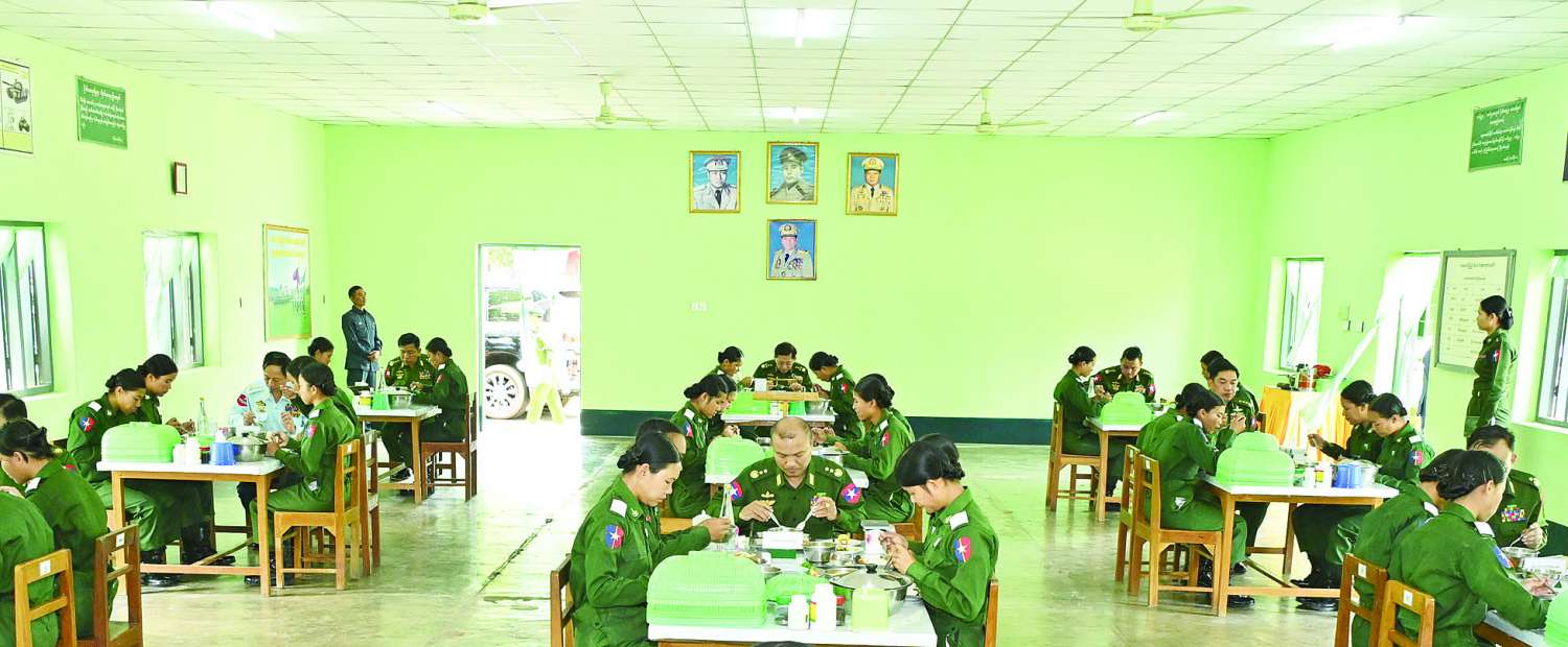 ယင်းနောက် နိုင်ငံတော်စီမံအုပ်ချုပ်ရေးကောင်စီဥက္ကဋ္ဌ တပ်မတော်ကာကွယ်ရေးဦးစီးချုပ်နှင့် အဖွဲ့ဝင်များသည် တပ်မတော် (ကြည်း) ဗိုလ်သင်တန်းကျောင်း (မှော်ဘီ) မှ အမျိုးသမီးဗိုလ်လောင်းသင်တန်းသူများ၊ အမျိုးသမီးအရာရှိ ခြေလျင်တပ်စုမှူးသင်တန်းမှ သင်တန်းသူများနှင့်အတူ နေ့လယ်စာကို အတူတကွသုံးဆောင်ခဲ့ကြပြီး သင်တန်းသူများအား ရင်းရင်းနှီးနှီး လိုက်လံနှုတ်ဆက်၍ အားပေးစကားပြောကြားခဲ့သည်။