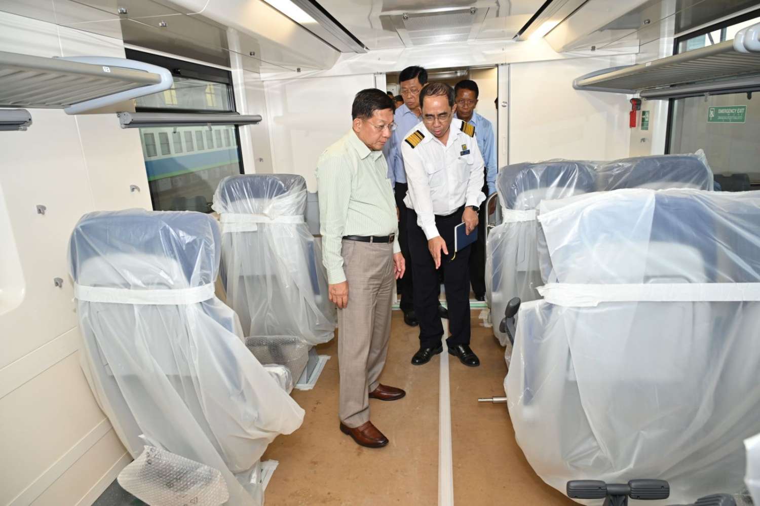 ထို့နောက် နိုင်ငံတော်စီမံအုပ်ချုပ်ရေးကောင်စီဥက္ကဋ္ဌ နိုင်ငံတော်ဝန်ကြီးချုပ်နှင့် အဖွဲ့ဝင်များသည် စပိန်နိုင်ငံမှရောက်ရှိလာသည့် DEMU ရထားတွဲဆိုင်းအသစ်များအား ကြည့်ရှုစစ်ဆေးကာ တာဝန်ရှိသူများ၏ ရှင်းလင်းတင်ပြမှုများအပေါ် လိုအပ်သည်များမှာကြားခဲ့ကြောင်း သတင်းရရှိသည်။