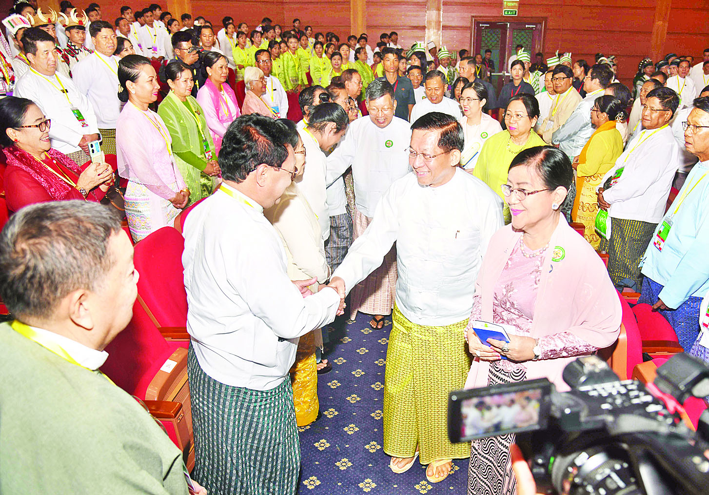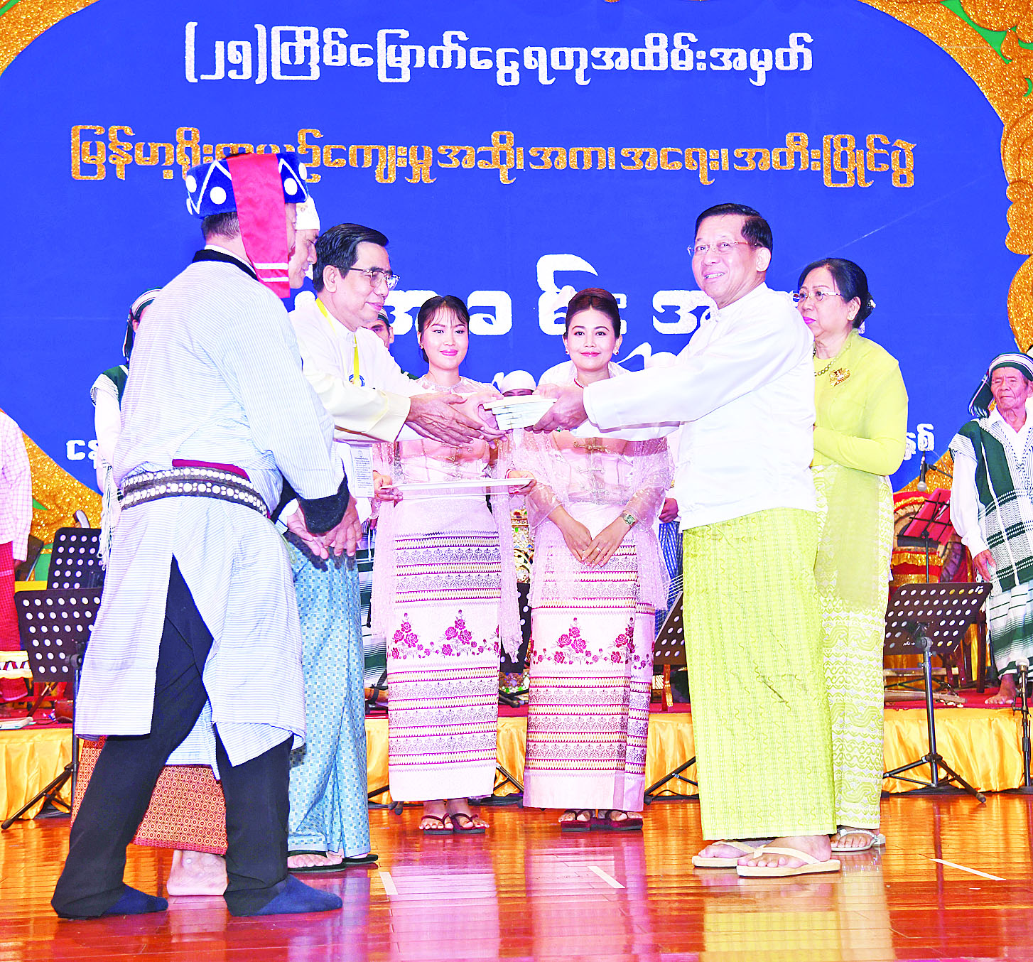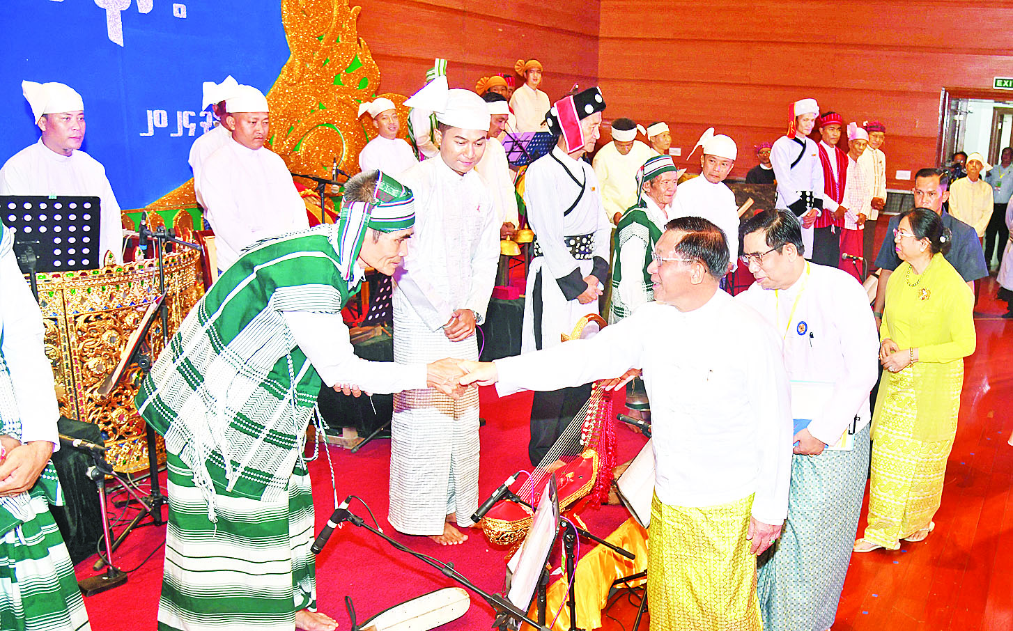 ယင်းနောက် နိုင်ငံတော်စီမံအုပ်ချုပ်ရေးကောင်စီဥက္ကဋ္ဌ နိုင်ငံတော်ဝန်ကြီးချုပ်နှင့်ဇနီးတို့သည် ဖျော်ဖြေတင်ဆက်ခဲ့ကြသည့် ပြည်ထောင်စုဖွားတိုင်းရင်းသားတို့၏ တိုင်းရင်းသားတူရိယာရိုးရာ သံစုံတေးဂီတအဖွဲ့မှ တိုင်းရင်းသားဂီတပညာရှင်များအား ရင်းရင်းနှီးနှီးလိုက်လံနှုတ်ဆက်၍ ဂုဏ်ပြုချီးမြှင့်ငွေများ ပေးအပ်ခဲ့သည်။