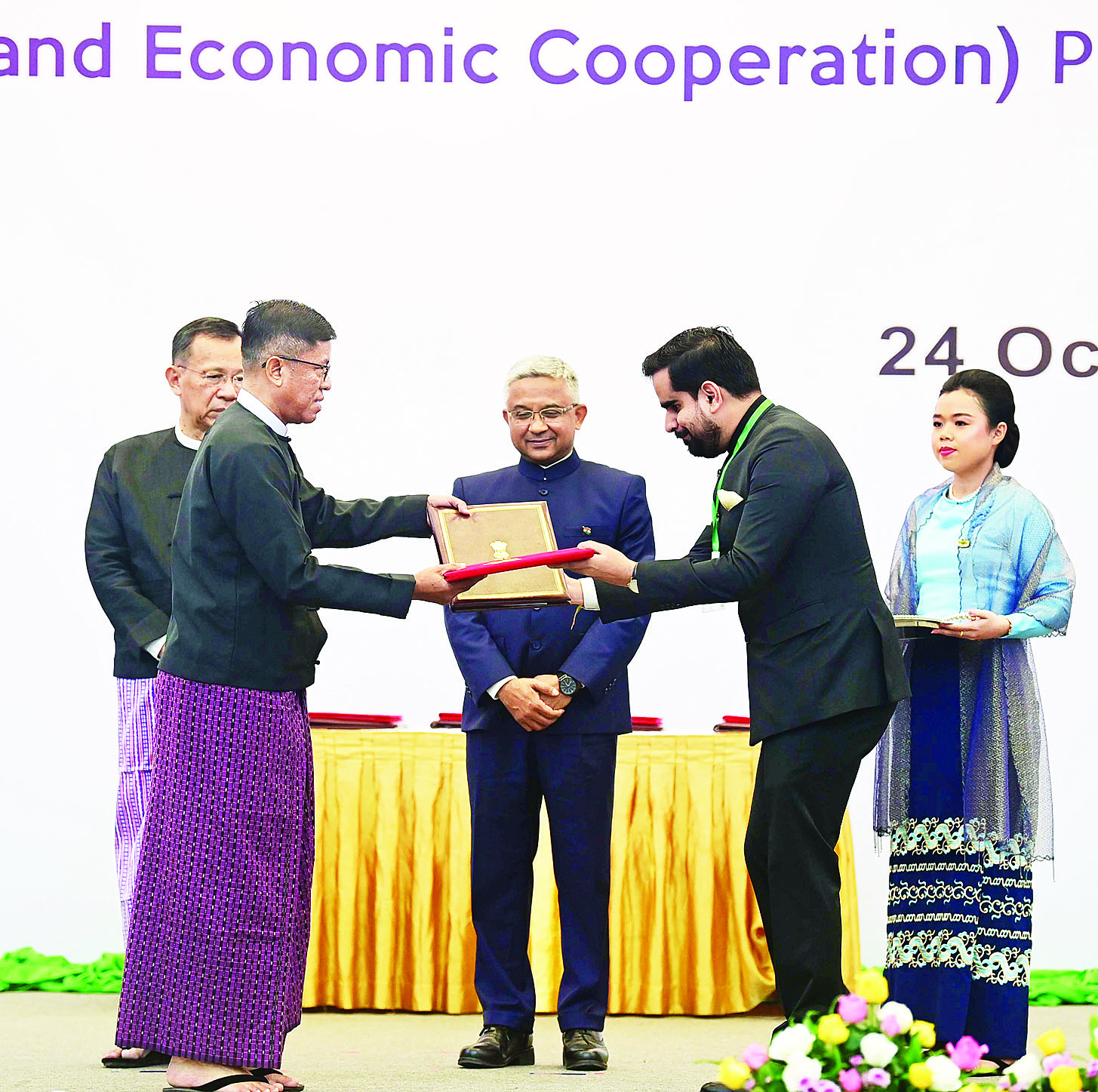 အိန္ဒိယနည်းပညာနှင့် စီးပွားရေးပူးပေါင်းဆောင်ရွက်မှုအစီအစဉ်၏ နှစ် (၆၀) ပြည့် အောင်မြင်မှုကို ဂုဏ်ပြုသည့် ယနေ့အစီအစဉ်မှသည် နောင်လာမည့်နှစ်များတွင် ပိုမိုကြီးမားသော အောင်မြင်မှုများရရှိပါစေကြောင်းကို ဆုမွန်ကောင်းတောင်းအပ်ပါကြောင်း၊ နှစ်နိုင်ငံအပြန်အလှန် လေးစားမှု၊ ပူးပေါင်းဆောင်ရွက်မှုနှင့် တူညီတဲ့မျှော်မှန်းချက်များကိုအခြေပြုပြီး မိမိတို့ နှစ်နိုင်ငံအကြား ချစ်ကြည်ရင်းနှီးသည့်ဆက်ဆံရေးနှင့် အိမ်နီးချင်းကောင်းအဖြစ် ရပ်တည်ဆက်ဆံဆောင်ရွက်ရေးတို့သည် တစ်နှစ်ထက်တစ်နှစ် ပိုမိုတိုးတက်ခိုင်မြဲလာမည်ဟု ယုံကြည်ထားပါကြောင်းဖြင့် ပြောကြားသည်။ ထို့နောက် ပြည်ထောင်စုသမ္မတမြန်မာနိုင်ငံတော်နှင့် အိန္ဒိယနိုင်ငံတို့အကြား မြန်ဆန်စွာအကျိုးဖြစ်ထွန်းစေမည့် (Quick Impact Projects-QIPs) အကောင်အထည်ဖော် ဆောင်ရွက်ရန်နှင့် နားလည်မှုစာချွန်လွှာလဲလှယ်ခြင်းအခမ်းအနားကို ဆက်လက်ကျင်းပပြုလုပ်ရာ ဒီဂျစ်တယ်မှုခင်းသိပ္ပံဓာတ်ခွဲခန်းအဆင့်မြှင့်တင်ရေးစီမံချက်၊ မြန်မာနိုင်ငံ အုပ်ချုပ်ရေးပညာဖွံ့ဖြိုးမှုသင်တန်းကျောင်းအတွက် သင်ကြားရေးအထောက်အကူပြု ပစ္စည်းကိရိယာများထောက်ပံ့ပေးခြင်းစီမံချက်၊ မြန်မာနိုင်ငံအလယ်ပိုင်း၊ အပူပိုင်းဒေသရှိ မိုးခေါင်ရေရှားမှုကြုံတွေ့နေရသည့်ကျေးရွာများ၌ ဆိုလာစွမ်းအင်အသုံးပြု၍ ကျေးလက်ရေထောက်ပံ့ရေးစီမံချက်၊ ရန်ကုန်နည်းပညာတက္ကသိုလ်တွင် အသိဉာဏ်တုဆိုင်ရာ ဓာတ်ခွဲခန်းတည်ဆောက်ခြင်းစီမံချက်၊ မြန်မာ့ကျေးလက်ဒေသ ဖွံ့ဖြိုးတိုးတက်ရေးအတွက် လယ်ယာစိုက်ပျိုးရေးစွန့်ပစ်ပစ္စည်းများဖြင့် နှေးကွေးသော Pyrolysis ပြုလုပ်ပြီး ကတ္တရာကင်းစင်ပြီး ခြောက်သွေ့သောဓာတ်ငွေ့အမျိုးအစား ရေပလတ်စတစ် Pyrolysis ဖြစ်စဉ်များမှရရှိသော လောင်စာများအား ပေါင်းစပ်သုံးစွဲခြင်းဖြစ်စဉ်အား စမ်းသပ်လေ့လာခြင်းစီမံချက် စသည့်နားလည်မှု စာချွန်လွှာများကို မြန်မာနိုင်ငံရှိ သက်ဆိုင်ရာဝန်ကြီးဌာနများမှ တာဝန်ရှိသူများနှင့် အိန္ဒိယနိုင်ငံသံရုံး ဒုတိယအကြီးအကဲတို့က ရင်းနှီးမြှုပ်နှံမှုနှင့် နိုင်ငံခြားစီးပွားဆက်သွယ်ရေးဝန်ကြီးဌာန ပြည်ထောင်စုဝန်ကြီး ဒေါက်တာကံဇော်နှင့် မြန်မာနိုင်ငံဆိုင်ရာ အိန္ဒိယနိုင်ငံသံအမတ်ကြီး H.E. Mr. Abhay Thakur တို့အား သက်သေထား၍ နိုင်ငံတော်စီမံအုပ်ချုပ်ရေးကောင်စီဥက္ကဋ္ဌ နိုင်ငံတော်ဝန်ကြီးချုပ် ရှေ့မှောက်တွင်လဲလှယ်ကြသည်။