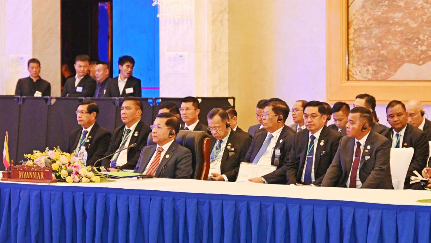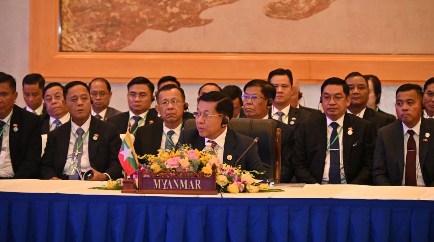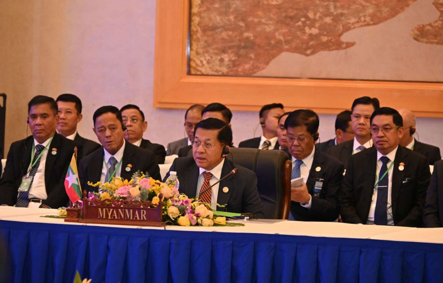 ဦးစွာ နိုင်ငံတော်စီမံအုပ်ချုပ်ရေးကောင်စီဥက္ကဋ္ဌနိုင်ငံတော်ဝန်ကြီးချုပ် ဗိုလ်ချုပ်မှူးကြီး မင်းအောင်လှိုင်သည် ထိပ်သီးအစည်းအဝေးသို့တက်ရောက်ရန် ရောက်ရှိလာရာ (အက်မက်စ်) ထိပ်သီးအစည်းအဝေးဥက္ကဋ္ဌ လာအိုနိုင်ငံဝန်ကြီးချုပ်က ကြိုဆိုနှုတ်ဆက်ပြီး တက်ရောက်လာကြသည့် အဖွဲ့ဝင်နိုင်ငံများမှ ဝန်ကြီးချုပ်များနှင့်အတူ စုပေါင်းမှတ်တမ်းတင် ဓာတ်ပုံရိုက်ကြသည်။