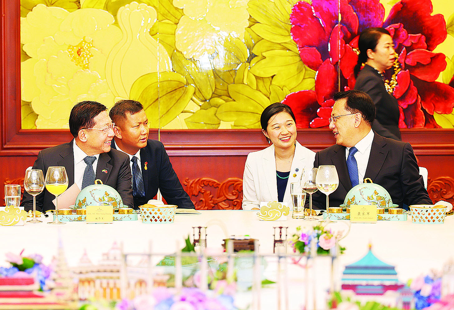 တွေ့ဆုံပွဲသို့ နိုင်ငံတော်စီမံအုပ်ချုပ်ရေးကောင်စီဥက္ကဋ္ဌ နိုင်ငံတော်ဝန်ကြီးချုပ်နှင့်အတူ ကောင်စီတွဲဖက်အတွင်းရေးမှူး ဗိုလ်ချုပ်ကြီး ရဲဝင်းဦးနှင့် ခရီးစဉ်တွင်လိုက်ပါလာကြသည့် အရာရှိကြီးများနှင့် တာဝန်ရှိသူများ၊ တရုတ်နိုင်ငံဆိုင်ရာ မြန်မာနိုင်ငံသံအမတ်ကြီးတို့ တက်ရောက်ကြပြီး တရုတ်ကွန်မြူနစ်ပါတီဗဟိုကော်မတီအဖွဲ့ဝင်၊ ချုံချင့်မြူနီစီပယ်ပါတီကော်မတီအတွင်းရေးမှူးနှင့်အတူ မြန်မာနိုင်ငံဆိုင်ရာ တရုတ်နိုင်ငံသံအမတ်ကြီးနှင့် တာဝန်ရှိသူများ တက်ရောက်ကြသည်။