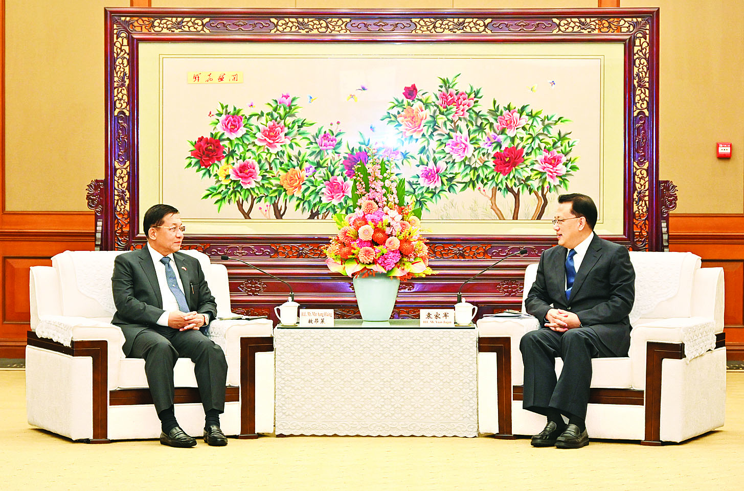 တရုတ်ပြည်သူ့သမ္မတနိုင်ငံ၊ ချုံချင့်မြို့သို့ရောက်ရှိနေသည့် နိုင်ငံတော်စီမံအုပ်ချုပ်ရေးကောင်စီဥက္ကဋ္ဌ နိုင်ငံတော်ဝန်ကြီးချုပ် ဗိုလ်ချုပ်မှူးကြီး မင်းအောင်လှိုင်သည် တရုတ်ကွန်မြူနစ်ပါတီဗဟိုကော်မတီအဖွဲ့ဝင်၊ ချုံချင့်မြူနီစီပယ်ပါတီကော်မတီအတွင်းရေးမှူး Mr. Yuan Jiajun နှင့် ယနေ့ညနေပိုင်းတွင် Yuzhou Hotel ဧည့်ခန်းမဆောင်၌ တွေ့ဆုံဆွေးနွေးသည်။