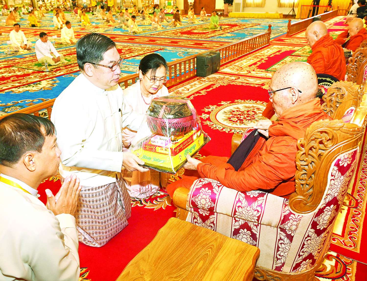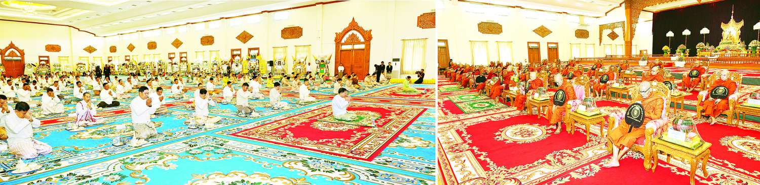 ဦးစွာ နိုင်ငံတော်စီမံအုပ်ချုပ်ရေးကောင်စီဥက္ကဋ္ဌ နိုင်ငံတော်ဝန်ကြီးချုပ်သည် သာသနာ့မဟာဗိမာန်တော်အတွင်းရှိ ဗုဒ္ဓရုပ်ပွားတော်မြတ်အား ဖူးမြော်ကြည်ညို၍ မြသပိတ်ဆွမ်းတော်၊ ပန်း၊ ရေချမ်း၊ ဆီမီးနှင့် သစ်သီးတို့ကို ဆက်ကပ်လှူဒါန်းသည်။