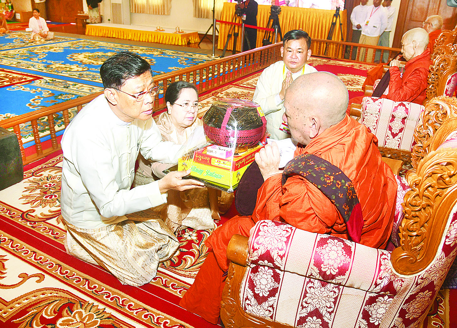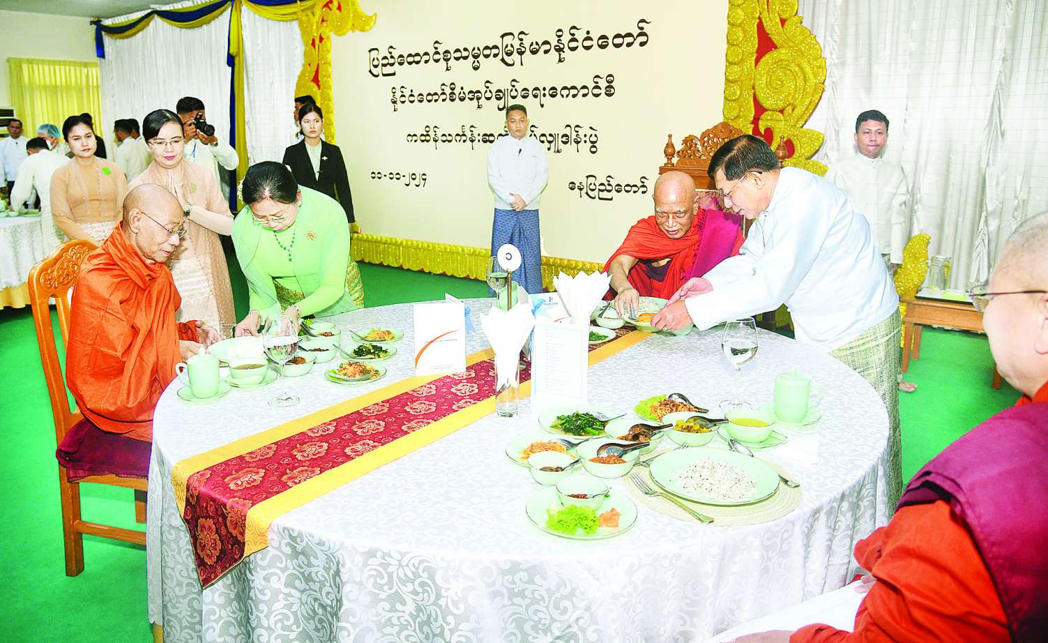 ယင်းနောက် “ဗုဒ္ဓသာသနံ စိရံ တိဋ္ဌတု သုံးကြိမ်ရွတ်ဆိုဆုတောင်း၍ အခမ်းအနားကို ရုပ်သိမ်းလိုက်သည်။ အခမ်းအနားအပြီးတွင် သန်လျင်မင်းကျောင်း ဆရာတော်ကြီးအမှူးပြုသည့် ဆရာတော်၊ သံဃာတော်များအား နိုင်ငံတော်စီမံအုပ်ချုပ်ရေးကောင်စီဥက္ကဋ္ဌနှင့်ဇနီး၊ ဧည့်ပရိသတ်များက နေ့ဆွမ်းဆက်ကပ်လှူဒါန်းခဲ့သည်။