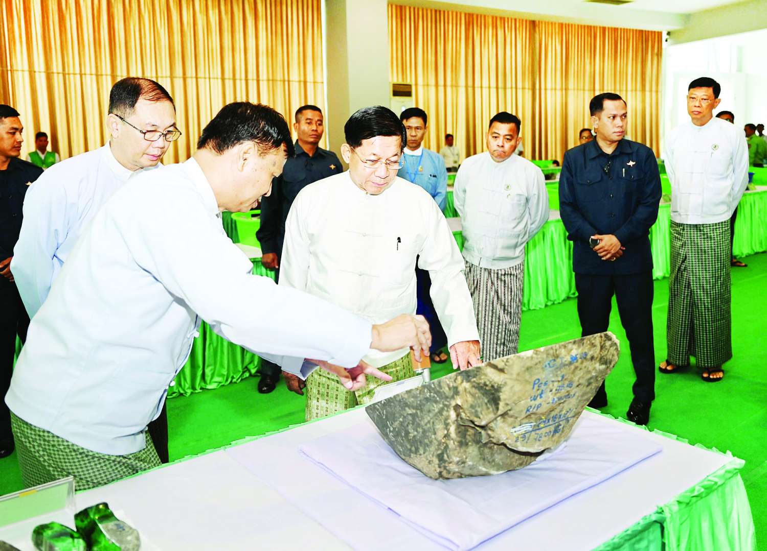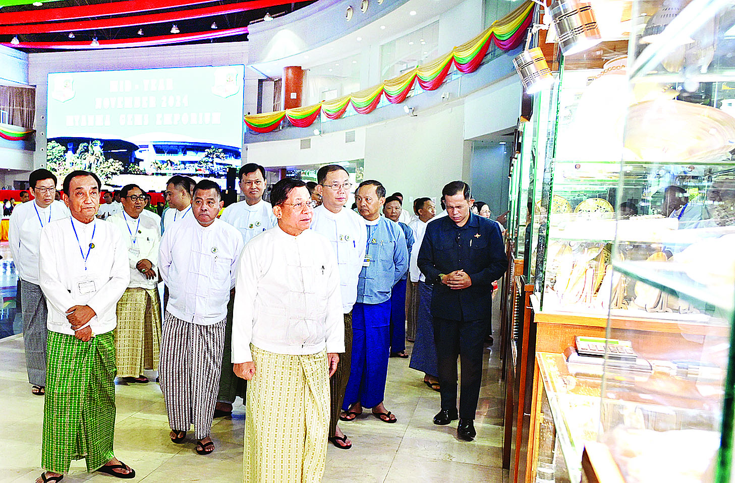 ယင်းနောက် နိုင်ငံတော်စီမံအုပ်ချုပ်ရေးကောင်စီဥက္ကဋ္ဌ နိုင်ငံတော်ဝန်ကြီးချုပ်နှင့် အခမ်းအနားတက်ရောက်လာကြသူများသည် ၂၀၂၄ ခုနှစ် နှစ်လယ်မြန်မာ့ကျောက်မျက်ရတနာပြပွဲ၌ ရောင်းချရန် မဏိရတနာကျောက်စိမ်းခန်းမအတွင်း ပြသထားသော ကျောက်စိမ်း၊ ကျောက်မျက်အတွဲများနှင့် ပုလဲအတွဲများကို လိုက်လံကြည့်ရှုစစ်ဆေးပြီး တာဝန်ရှိသူများ၏ ရှင်းလင်းတင်ပြမှုအပေါ် နိုင်ငံတော်စီမံအုပ်ချုပ်ရေးကောင်စီဥက္ကဋ္ဌ နိုင်ငံတော်ဝန်ကြီးချုပ်က လိုအပ်သည်များ လမ်းညွှန်မှာကြားသည်။