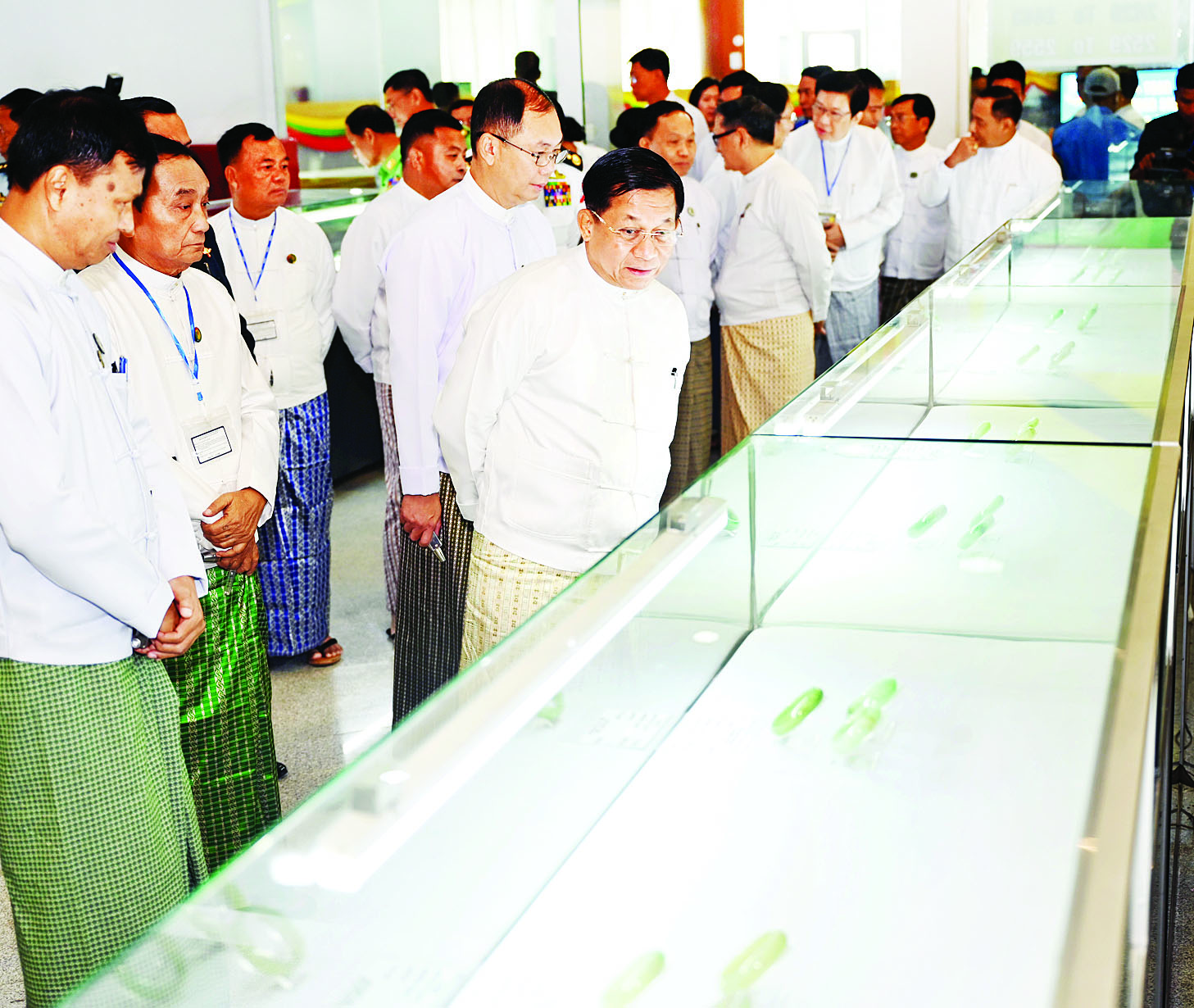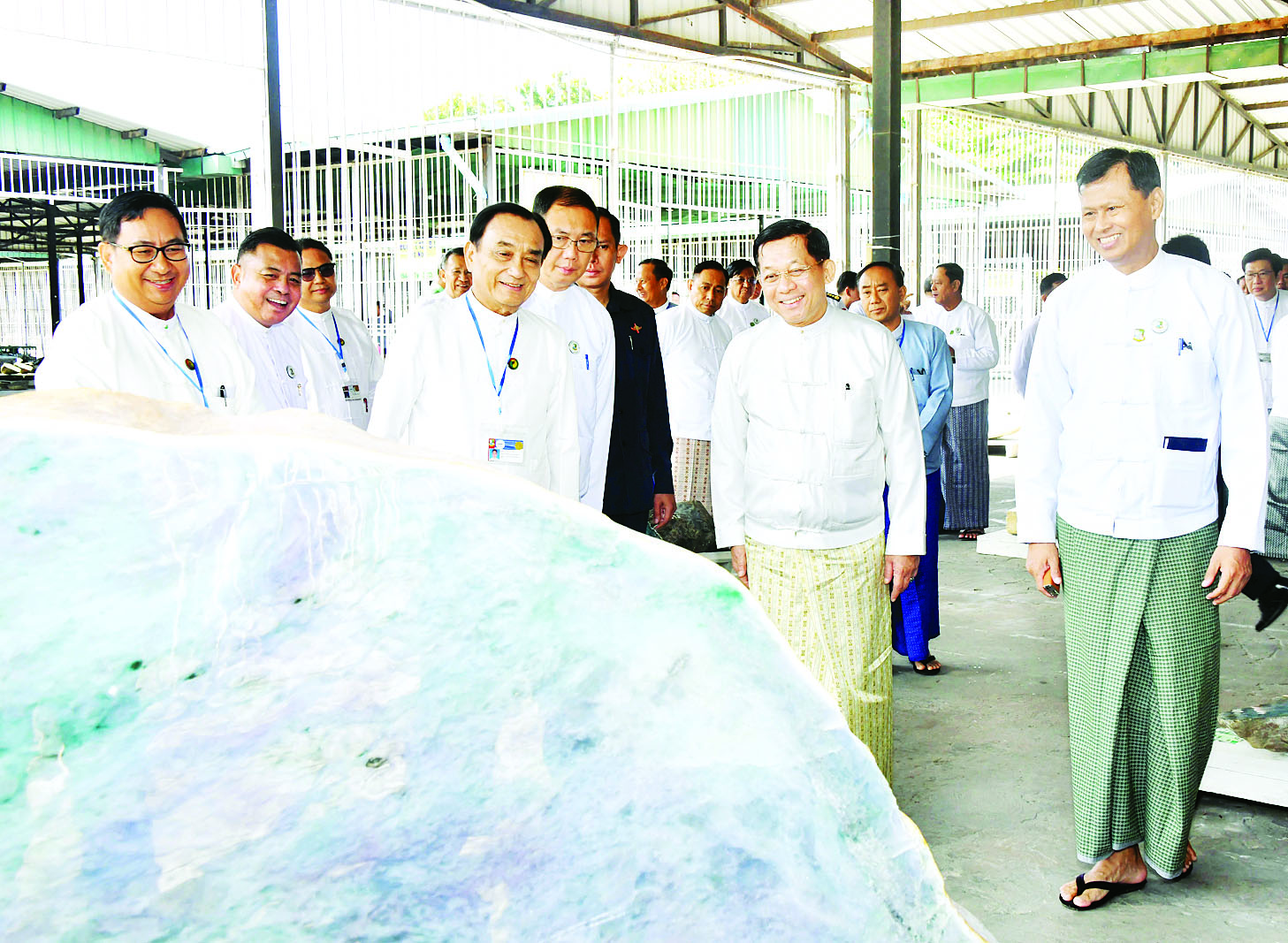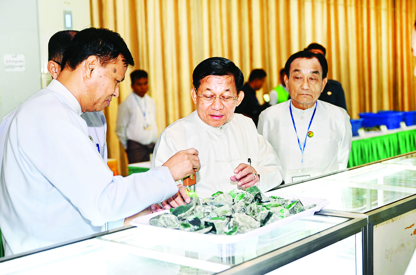 ထို့နောက် နိုင်ငံတော်စီမံအုပ်ချုပ်ရေးကောင်စီဥက္ကဋ္ဌ နိုင်ငံတော်ဝန်ကြီးချုပ်နှင့် အဖွဲ့ဝင်များသည် ပုဂ္ဂလိကကျောက်မျက်ရတနာ အချောထည်အရောင်းပြခန်းများ ဖွင့်လှစ်ရောင်းချနေမှုကို လိုက်လံကြည့်ရှုအားပေးပြီး ခန်းမအပြင်ဘက်တွင် ခင်းကျင်းပြသထားသည့် ကျောက်စိမ်းရိုင်းအတွဲများကို လိုက်လံကြည့်ရှုစစ်ဆေးသည်။