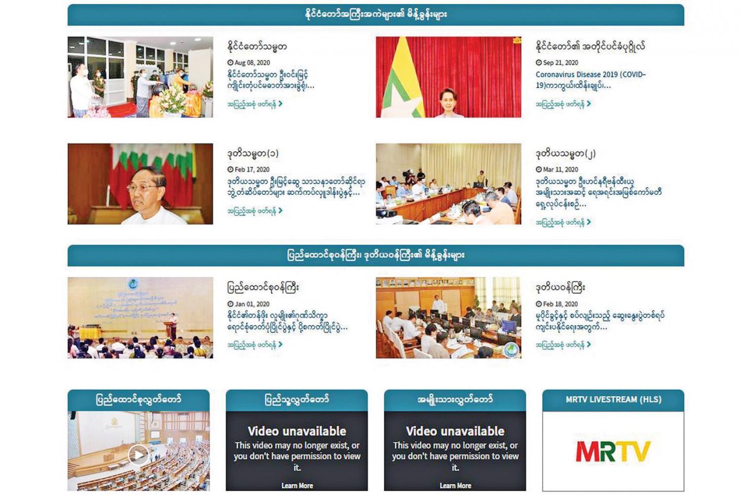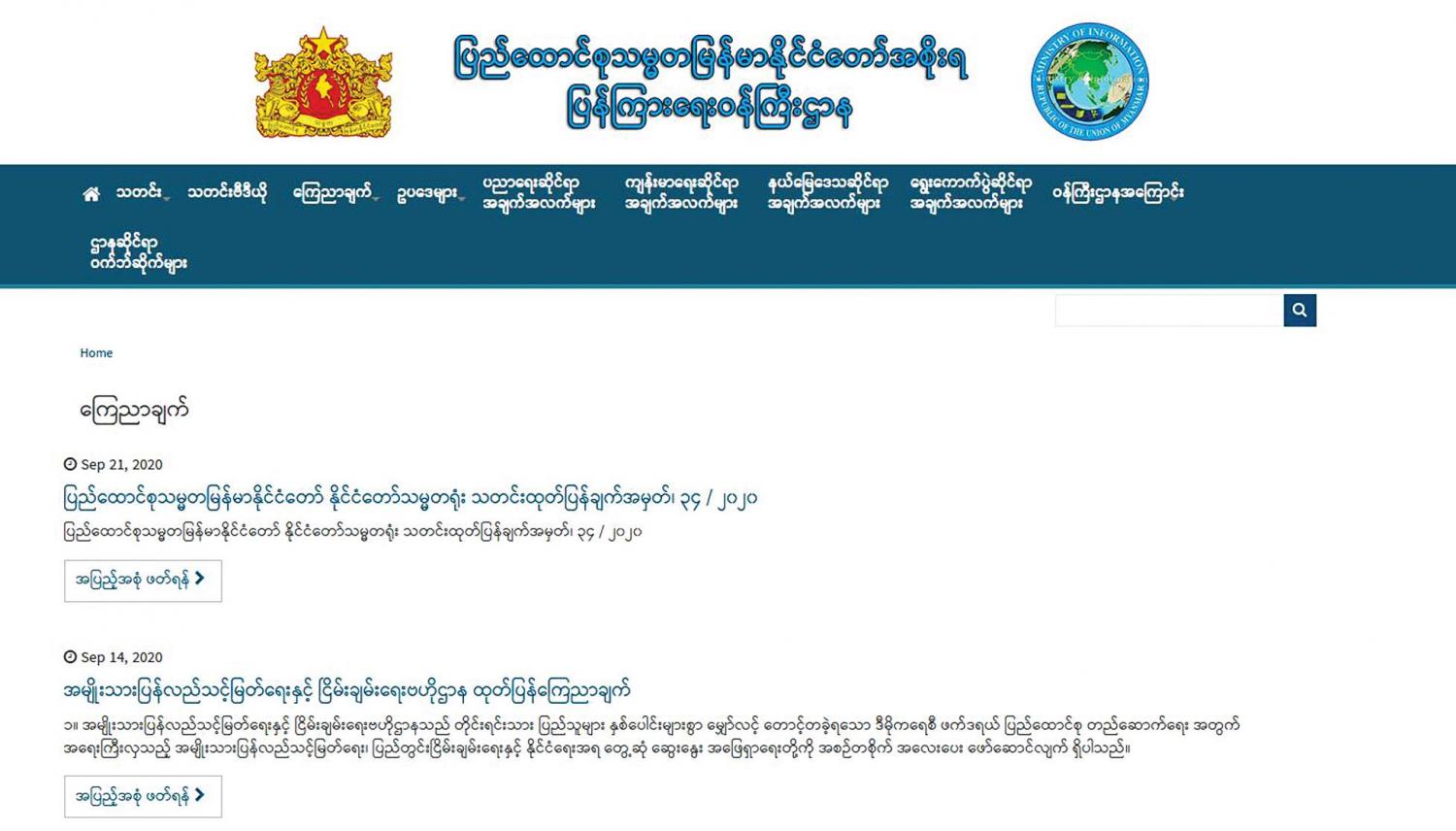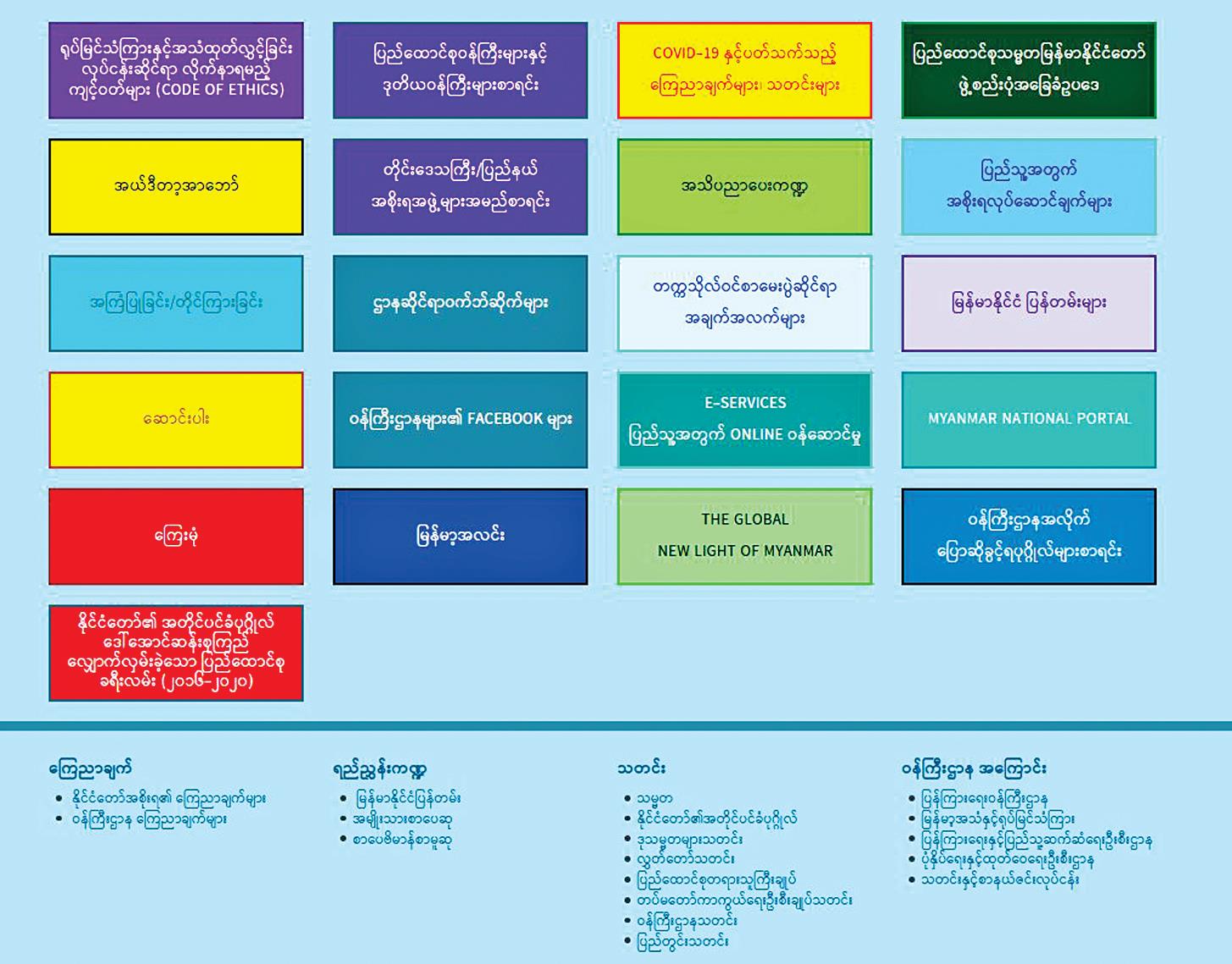 ပြန်ကြားရေးဝန်ကြီးဌာန သတင်းနှင့် စာနယ်ဇင်း လုပ်ငန်းက ထုတ်ဝေလျက်ရှိတဲ့ နေ့စဉ်ထုတ်သတင်းစာ တွေ၊ MRTV live stream ၊ လွှတ်တော် live stream ၊ နိုင်ငံတော်ဆိုင်ရာပြန်တမ်း၊ ဌာနဆိုင်ရာပြောခွင့်ရပုဂ္ဂိုလ် တွေ စာရင်း၊ ပြည်ထောင်စုဝန်ကြီး၊ ဒုတိယဝန်ကြီး စာရင်းတွေ၊ တိုင်းဒေသကြီး ပြည်နယ်အစိုးရအဖွဲ့ အမည်စာရင်းတွေ၊ ဥပဒေတွေ၊ နိုင်ငံတော်အကြီးအကဲမိန့်ခွန်းတွေအားလုံးကို တစ်နေရာတည်းမှာ တစု တစည်းတည်းရနိုင်တာကိုလည်း တွေ့ရပါတယ်။ အခု နောက်ပိုင်းမှာ အသစ်ထပ်တိုးထားတဲ့ ကဏ္ဍသစ်တွေ ကိုလည်း တွေ့ရပါတယ်။