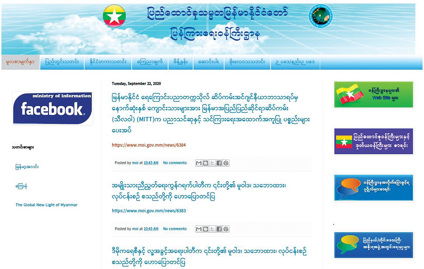 ဝန်ကြီးဌာနအသီးသီးနှင့် ဌာနဆိုင်ရာ ဝက်ဘ်ဆိုက်တွေ တည်ဆောက်နိုင်ရေးဆိုတာ နိုင်ငံတော်ရဲ့ e-government လုပ်ငန်းစဉ် အစိတ်အပိုင်းတစ်ခု ဖြစ်ပါတယ်။ ပြန်ကြားရေးဝန်ကြီးဌာနက e-government လုပ်ငန်းစဉ်တွေကို ဖော်ဆောင်ရင်း တစ်ဖက်မှာလည်း သတင်းမီဒီယာကဏ္ဍကို ဖြည့်ဆည်းပေးတဲ့အနေနဲ့ သတင်းထုတ်ပြန်ရေးကဏ္ဍကို ပူးတွဲတာဝန်ထမ်းဆောင် ပေးနေတဲ့ အွန်လိုင်းပလက်ဖောင်းကတော့ www.moi.gov.mm ပဲ ဖြစ်ပါတယ်။