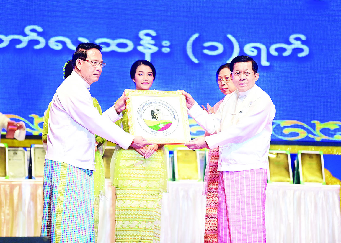 ၎င်းနောက် နိုင်ငံတော်စီမံအုပ်ချုပ်ရေးကောင်စီဥက္ကဋ္ဌ နိုင်ငံတော်ဝန်ကြီးချုပ်နှင့် ဇနီးတို့အား ပြန်ကြားရေးဝန်ကြီးဌာန ပြည်ထောင်စုဝန်ကြီး ဦးမောင်မောင်အုန်းက (၇၅) ကြိမ်မြောက် စိန်ရတုအမျိုးသားစာပေဆု အထိမ်းအမှတ်ဂုဏ်ပြုလက်ဆောင်အား ဂါရဝပြုပေးအပ်သည်။