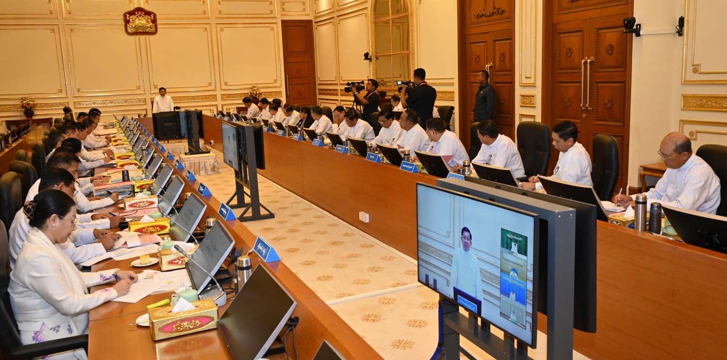 ပြည်ထောင်စုအစိုးရအဖွဲ့အစည်းအဝေးကို ယနေ့မွန်းလွဲပိုင်းတွင် နေပြည်တော်ရှိ နိုင်ငံတော်စီမံအုပ်ချုပ်ရေးကောင်စီဥက္ကဋ္ဌရုံး အစည်းအဝေးခန်းမ၌ ကျင်းပရာ နိုင်ငံတော်စီမံအုပ်ချုပ်ရေးကောင်စီဥက္ကဋ္ဌ နိုင်ငံတော်ဝန်ကြီးချုပ် ဗိုလ်ချုပ်မှူးကြီး မင်းအောင်လှိုင် တက်ရောက်အမှာစကားပြောကြားသည်။
