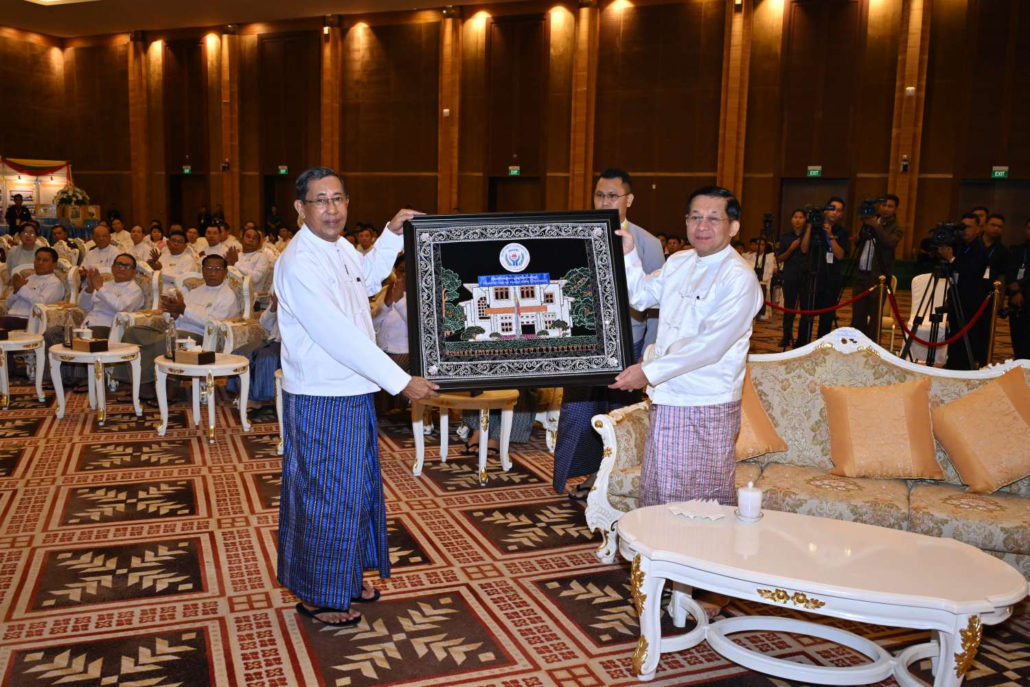 ၎င်းနောက် နိုင်ငံတော်စီမံအုပ်ချုပ်ရေးကောင်စီဥက္ကဋ္ဌ နိုင်ငံတော်ဝန်ကြီးချုပ်ထံ မြန်မာနိုင်ငံအမျိုးသားလူ့အခွင့်ရေးကော်မရှင်ဥက္ကဋ္ဌက (၇၆) နှစ်မြောက် အပြည်ပြည်ဆိုင်ရာ လူ့အခွင့်အရေးနေ့ အထိမ်းအမှတ်တံဆိပ်အား ဂါရဝပြုပေးအပ်သည်။