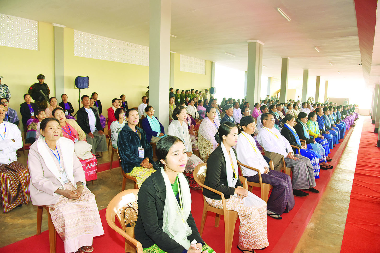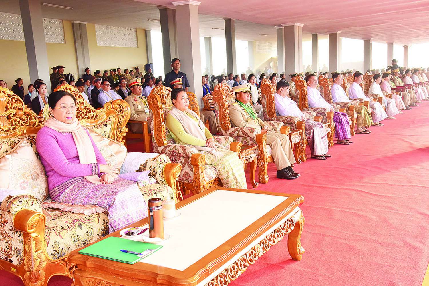 အဆိုပါအခမ်းအနားသို့ နိုင်ငံတော်စီမံအုပ်ချုပ်ရေးကောင်စီဥက္ကဋ္ဌ တပ်မတော်ကာကွယ်ရေးဦးစီးချုပ်နှင့်အတူ ဇနီး ဒေါ်ကြူကြူလှ၊ ညှိနှိုင်းကွပ်ကဲရေးမှူး (ကြည်း၊ ရေ၊ လေ) ဗိုလ်ချုပ်ကြီး သီရိပျံချီ စည်သူ မောင်မောင်အေးနှင့်ဇနီး၊ ကာကွယ်ရေးဦးစီးချုပ်(ရေ) ဗိုလ်ချုပ်ကြီး ဇေယျကျော်ထင် ထိန်ဝင်းနှင့်ဇနီး၊ ကာကွယ်ရေးဦးစီးချုပ်(လေ) ဗိုလ်ချုပ်ကြီး ဇေယျကျော်ထင် စည်သူထွန်းအောင်နှင့်ဇနီး၊ ကာကွယ်ရေးဦးစီးချုပ်ရုံးမှ အဆင့်မြင့် တပ်မတော်အရာရှိကြီးများနှင့် ဇနီးများ၊ ပြည်ထောင်စုဝန်ကြီးများ၊ မန္တလေးတိုင်းဒေသကြီးဝန်ကြီးချုပ်နှင့်ဇနီး၊ အလယ်ပိုင်းတိုင်းစစ်ဌာနချုပ်တိုင်းမှူး၊ တပ်မတော်နည်းပညာ တက္ကသိုလ်ကျောင်းအုပ်ကြီး၊ ပြင်ဦးလွင်တပ်နယ်မှ တာဝန်ရှိသူများ၊ ကျောင်းဆင်းဗိုလ်လောင်းများ၏ မိဘဆွေမျိုးများနှင့် ဖိတ်ကြားထားသည့် ဧည့်သည့်တော်များ တက်ရောက်ကြသည်။