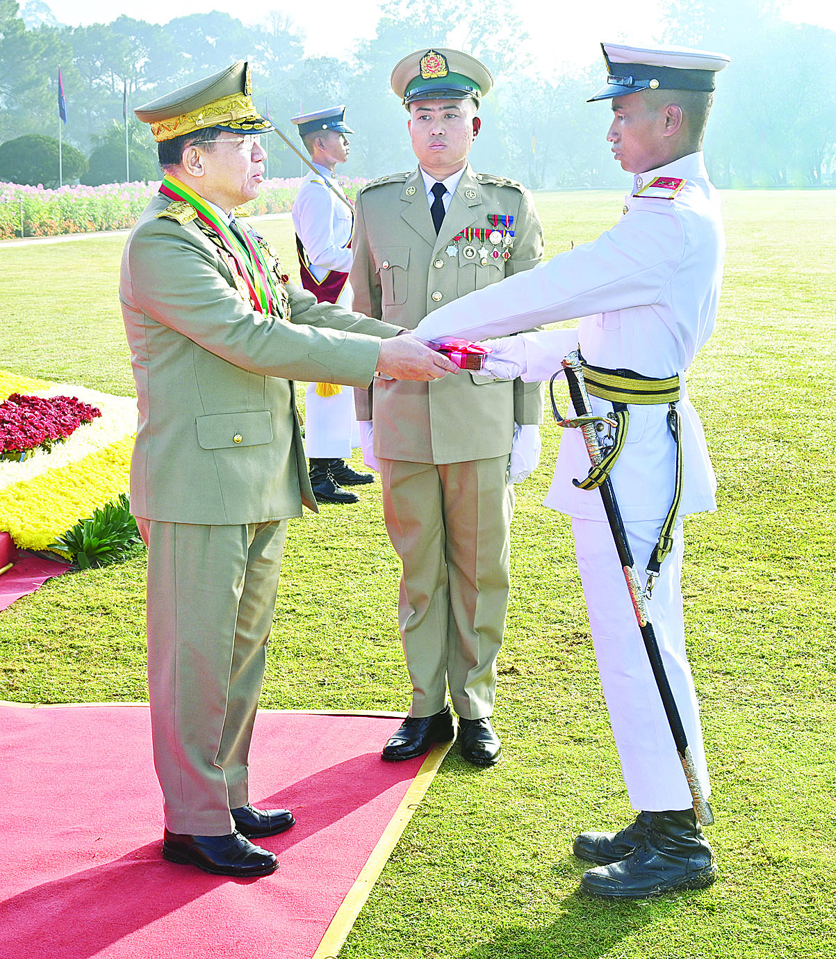 ယင်းနောက် နိုင်ငံတော်စီမံအုပ်ချုပ်ရေးကောင်စီဥက္ကဋ္ဌ တပ်မတော်ကာကွယ်ရေးဦးစီးချုပ် ဗိုလ်ချုပ်မှူးကြီး သတိုးမဟာသရေစည်သူ သတိုးသီရိသုဓမ္မ မင်းအောင်လှိုင်သည် ဗိုလ်လောင်းတပ်ခွဲများ၏ အလေးပြုခြင်းကို ခံယူပြီးနောက် စစ်ရေးပြအခမ်းအနားမှ ပြန်လည်ထွက်ခွာသည်။