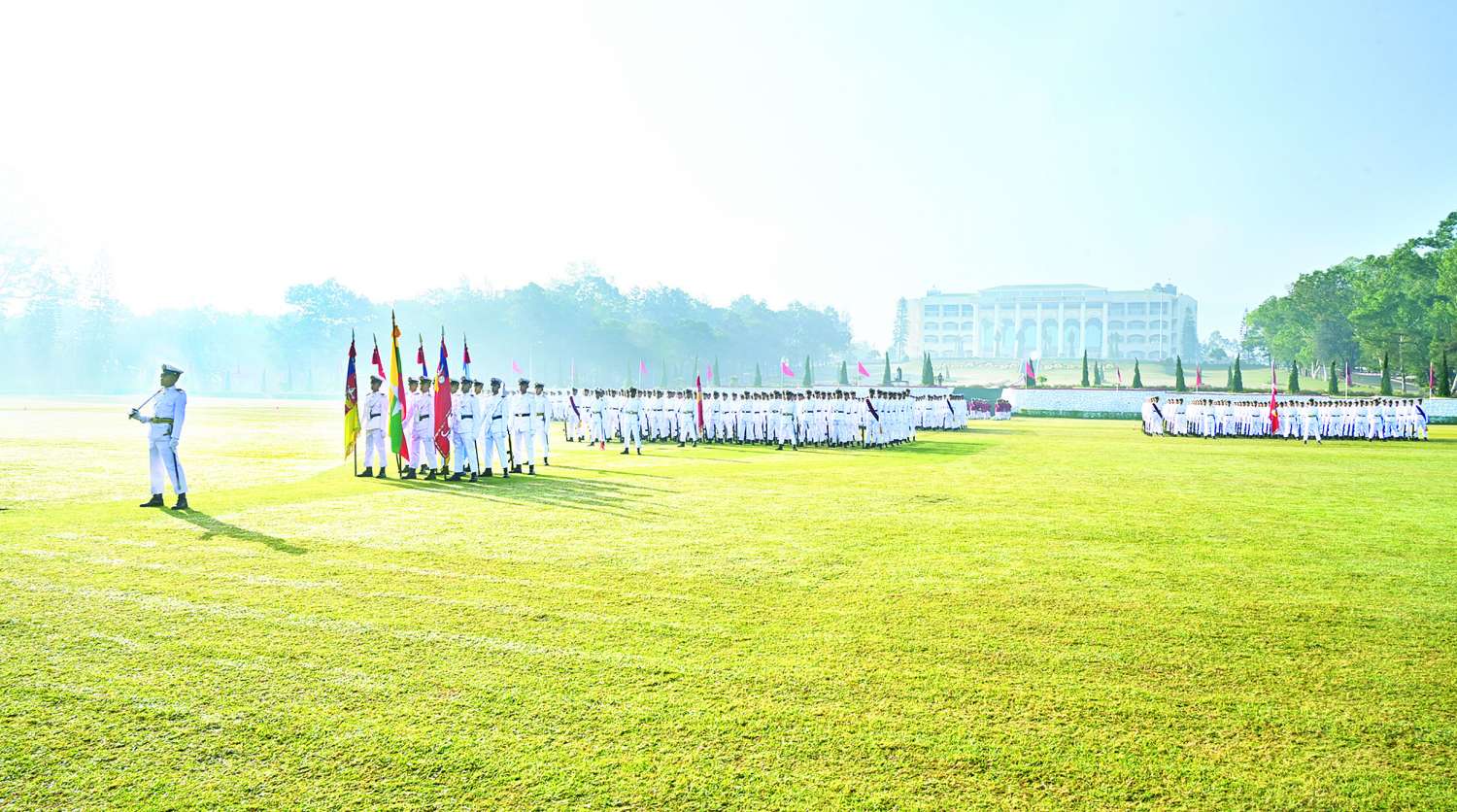ဦးစွာ နိုင်ငံတော်စီမံအုပ်ချုပ်ရေးကောင်စီဥက္ကဋ္ဌ တပ်မတော်ကာကွယ်ရေးဦးစီးချုပ် ဗိုလ်ချုပ်မှူးကြီး သတိုးမဟာသရေစည်သူ သတိုးသီရိသုဓမ္မ မင်းအောင်လှိုင် က ဗိုလ်လောင်းတပ်ခွဲများ၏ အလေးပြုခြင်းကိုခံယူပြီး ကျောင်းဆင်းဗိုလ်လောင်းတပ်ခွဲအား စစ်ဆေးသည်။ ထို့နောက် ဗိုလ်လောင်းတပ်ခွဲများက နိုင်ငံတော်စီမံအုပ်ချုပ်ရေးကောင်စီဥက္ကဋ္ဌ တပ်မတော်ကာကွယ်ရေးဦးစီးချုပ် ဗိုလ်ချုပ်မှူးကြီး သတိုးမဟာသရေစည်သူ သတိုးသီရိသုဓမ္မ မင်းအောင်လှိုင်အား အနှေးလျှောက်၊ အမြန်လျှောက်ဖြင့် ချီတက်အလေးပြုကြသည်။