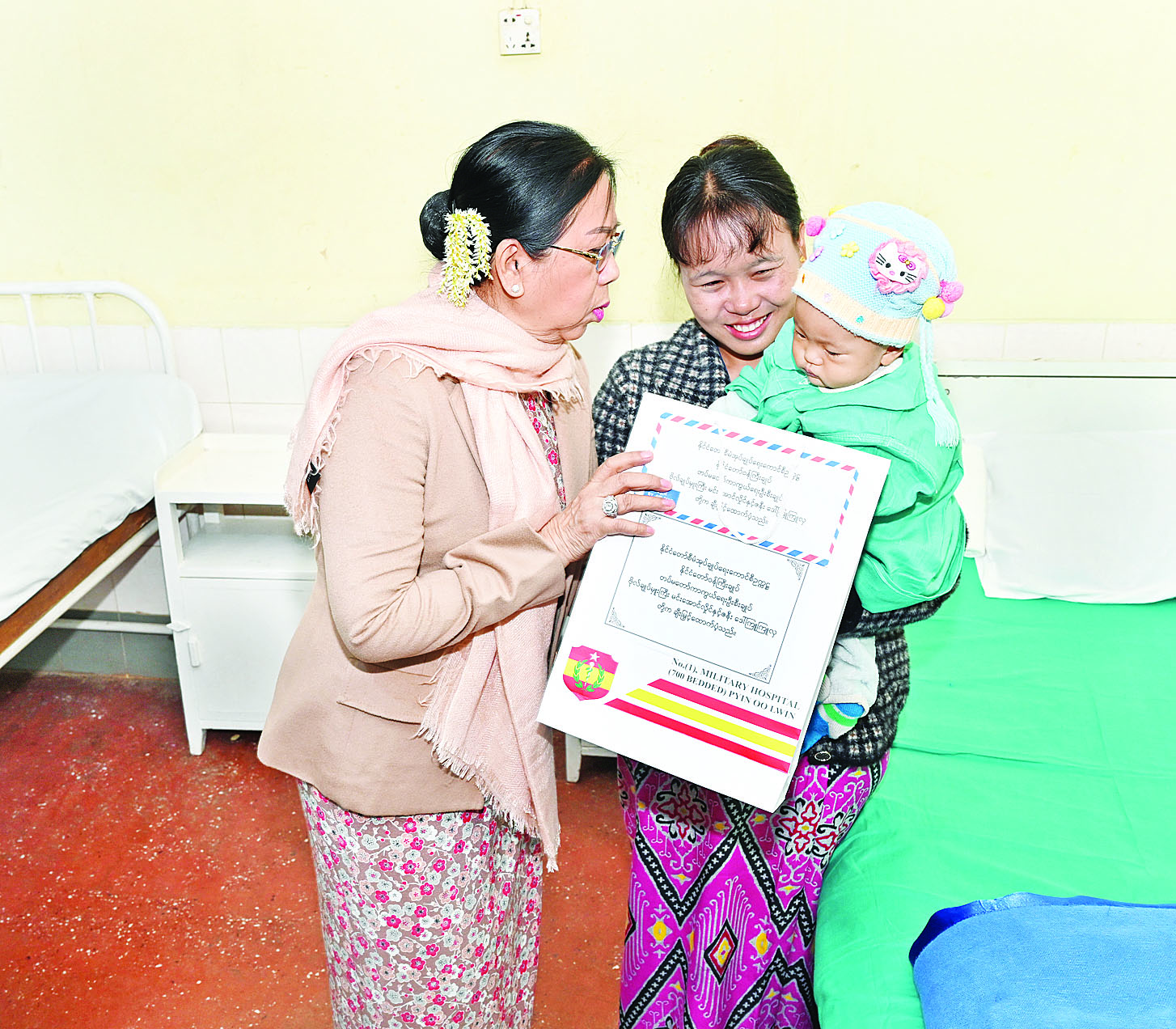 အလားတူ နိုင်ငံတော်စီမံအုပ်ချုပ်ရေးကောင်စီဥက္ကဋ္ဌ တပ်မတော်ကာကွယ်ရေးဦးစီးချုပ်၏ ဇနီးဒေါ်ကြူကြူလှသည်လည်း အဖွဲ့ဝင်များလိုက်ပါ၍ သားဖွားမီးယပ်နှင့် ကလေးကုသဆောင်၌ တက်ရောက်ကုသလျက်ရှိသည့် တပ်မတော်သား မိသားစုဝင်များကို တစ်ဦးချင်းရင်းနှီးနွေးထွေးစွာဖြင့် လိုက်လံအားပေးစကားပြောကြားပြီး လက်ဆောင်ပစ္စည်းများ ပေးအပ်ခဲ့သည်။