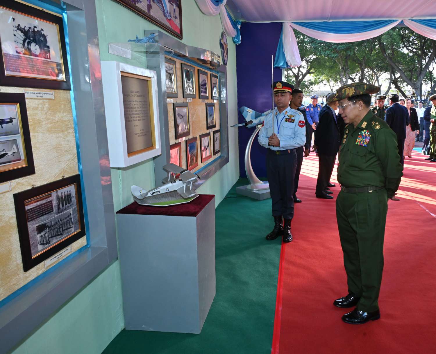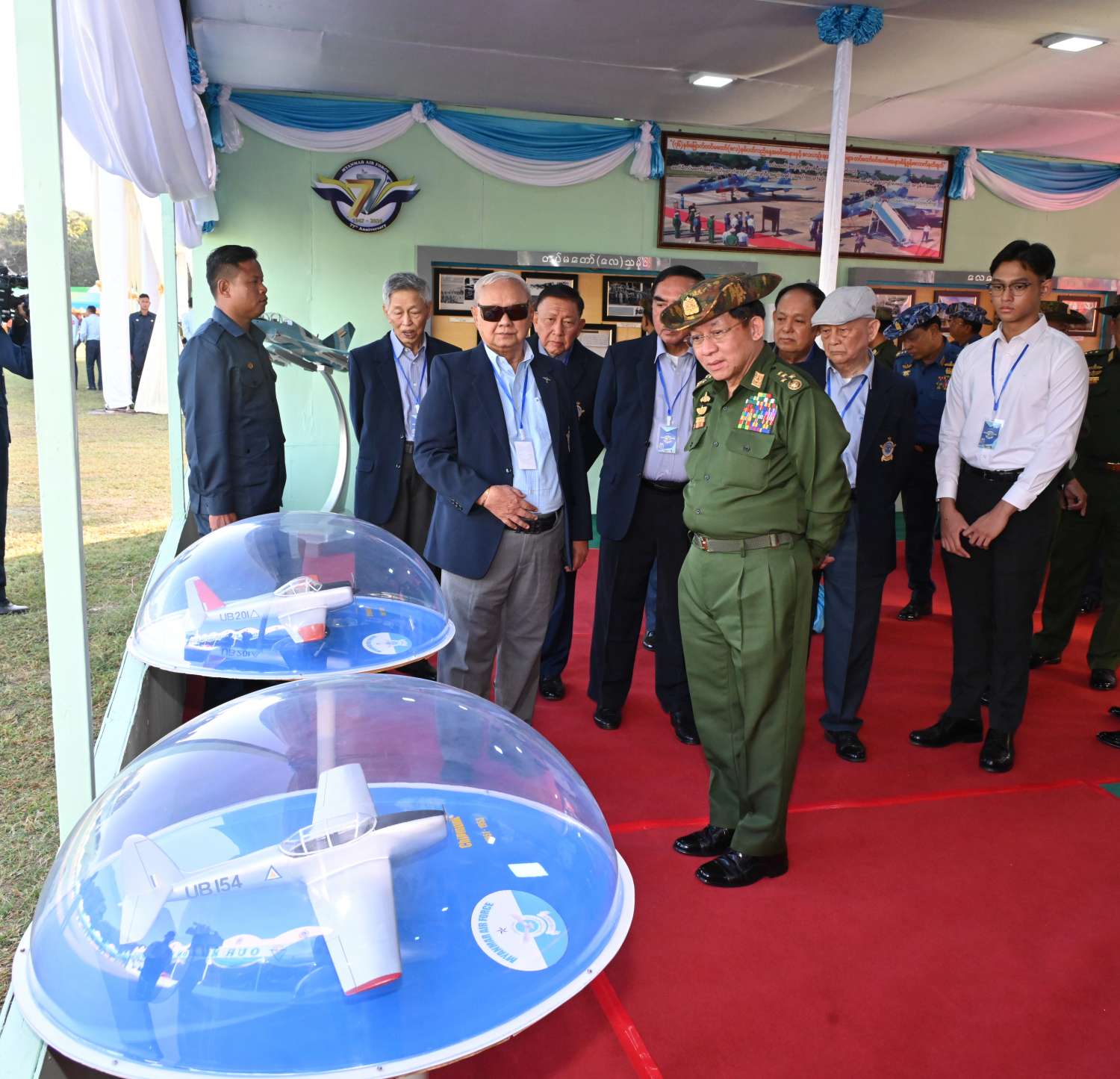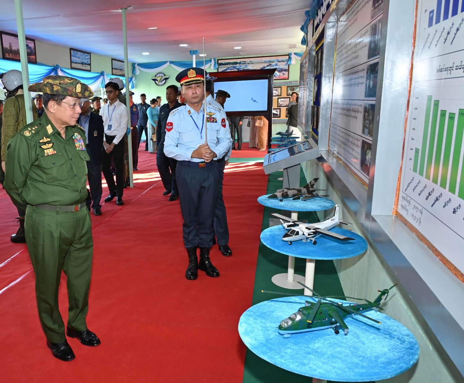 ထို့အပြင် ဒီဇင်ဘာ ၁၄ ရက် ညနေပိုင်းကလည်း နိုင်ငံတော်စီမံအုပ်ချုပ်ရေးကောင်စီဥက္ကဋ္ဌ တပ်မတော်ကာကွယ်ရေးဦးစီးချုပ် ဗိုလ်ချုပ်မှူးကြီး မင်းအောင်လှိုင်နှင့် အဖွဲ့ဝင်များသည် တပ်မတော် (လေ) ၏ (၇၇) နှစ်မြောက်နှစ်ပတ်လည်နေ့နှင့် လေယာဉ်/ ရဟတ်ယာဉ်များ တပ်တော်ဝင်အခမ်းအနားအထိမ်းအမှတ်အဖြစ် ပြခန်းများအတွင်း ပြသထားသည့် လေကြောင်းသမိုင်းမှတ်တမ်းများ၊ ခေတ်အဆက်ဆက်အသုံးပြုခဲ့သည့် တပ်မတော် (လေ) ဝတ်စုံများ၊ တပ်မတော် (လေ) သမိုင်းမှတ်တမ်းဓာတ်ပုံများ၊ ကာကွယ်ရေးဦးစီးချုပ် (လေ) တာဝန်ထမ်းဆောင်ခဲ့သူများ၏ မှတ်တမ်းဓာတ်ပုံများ၊ သမိုင်းဝင်လေယာဉ်၊ ရဟတ်ယာဉ်များနှင့် ၎င်းတို့ဆင်နွဲခဲ့သည့် တိုက်ပွဲမှတ်တမ်းများ၊ လေယာဉ်၊ ရဟတ်ယာဉ်များတွင် အသုံးပြုလျက်ရှိသည့် Avionics ပစ္စည်းများ၊ ခေတ်မီမျိုးဆက်သစ် တိုက်ခိုက်ရေးလေယာဉ်ပုံစံငယ်များနှင့် လေသူရဲအသုံးအဆောင်ပစ္စည်းများ၊ တပ်မတော် (လေ) တွင် အသုံးပြုလျက်ရှိသည့် လက်နက်၊ ခဲယမ်းများ၊ တပ်မတော် (လေ) မှ စွမ်းရည်ဘွဲ့တံဆိပ်ရရှိခဲ့သူများ၏ မှတ်တမ်းဓာတ်ပုံများ၊ လေယာဉ်၊ ရဟတ်ယာဉ်များ၊ တပ်တော်ဝင်အခမ်းအနား မှတ်တမ်းဓာတ်ပုံများ၊ တပ်မတော် (လေ) အရာရှိ၊ စစ်သည်၊ အစားခန့်များအား လေ့ကျင့်ပျိုးထောင်မှုမှတ်တမ်းဓာတ်ပုံများ၊ တပ်မတော် (လေ) ၏ နိုင်ငံတကာဆက်ဆံရေးဆိုင်ရာ မှတ်တမ်းဓာတ်ပုံများ၊ တပ်မတော် (လေ) ၏ တိုးတက်ပြောင်းလဲလာမှုမှတ်တမ်းဓာတ်ပုံများ၊ ကာကွယ်ရေးဦးစီးချုပ် (လေ) အဆက်ဆက်က ဆုရလေသူရဲများအား ဆုချီးမြှင့်ပေးအပ်သည့် မှတ်တမ်းဓာတ်ပုံများ၊ တပ်မတော် (လေ) မှ ထုတ်လုပ်ထားသည့် လေကြောင်းအီလက်ထရောနစ်ဆိုင်ရာ စက်ပစ္စည်းများအား လှည့်လည်ကြည့်ရှုကြသည်။