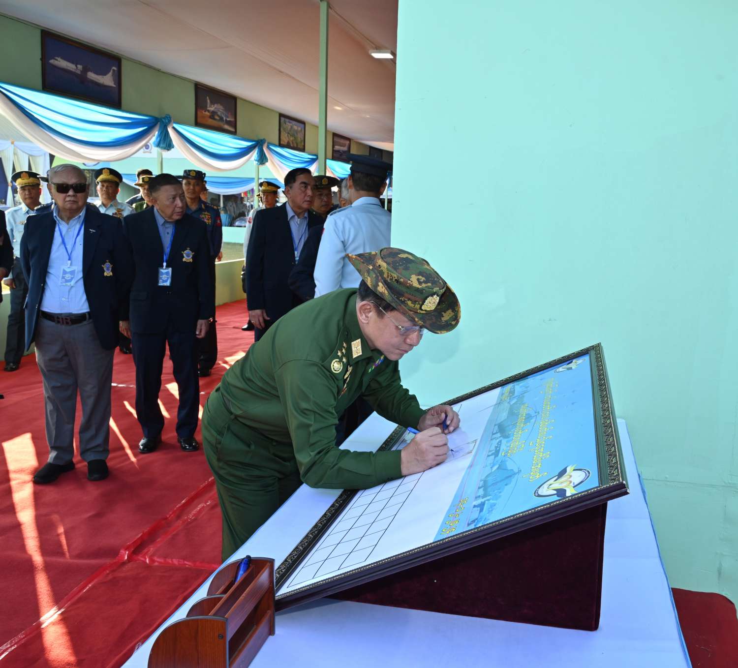ထို့နောက် နိုင်ငံတော်စီမံအုပ်ချုပ်ရေးကောင်စီဥက္ကဋ္ဌ တပ်မတော်ကာကွယ်ရေးဦးစီးချုပ်၊ ဇနီးနှင့် အဖွဲ့ဝင်များသည် တပ်မတော် (လေ) ၏ (၇၇) နှစ်မြောက် နှစ်ပတ်လည်နေ့အထိမ်းအမှတ်စာအုပ်တွင် မှတ်တမ်းတင်လက်မှတ်ရေးထိုးကြပြီးနောက် လေတပ်စခန်းဌာနချုပ်များအလိုက် အမှတ်တရပစ္စည်းအရောင်းဆိုင်နှင့် မြန်မာ့ရိုးရာ စားသောက်ဖွယ်ရာအရောင်းဆိုင်၊ စာအုပ်အရောင်းဆိုင်နှင့် တပ်မတော်မှ ထုတ်လုပ်သည့် လူသုံးကုန်ပစ္စည်းအရောင်းဆိုင်များအား ဆက်လက်ကြည့်ရှုအားပေးပြီး အရာရှိ၊ စစ်သည်၊ မိသားစုဝင်များအား ရင်းရင်းနှီးနှီး နှုတ်ဆက်ခဲ့ကြောင်း သတင်းရရှိသည်။
