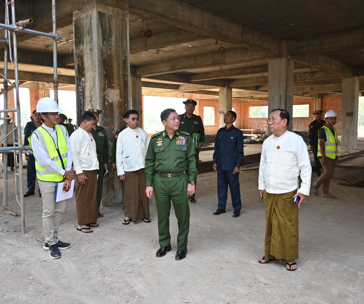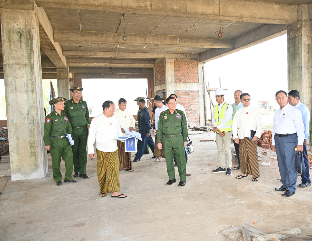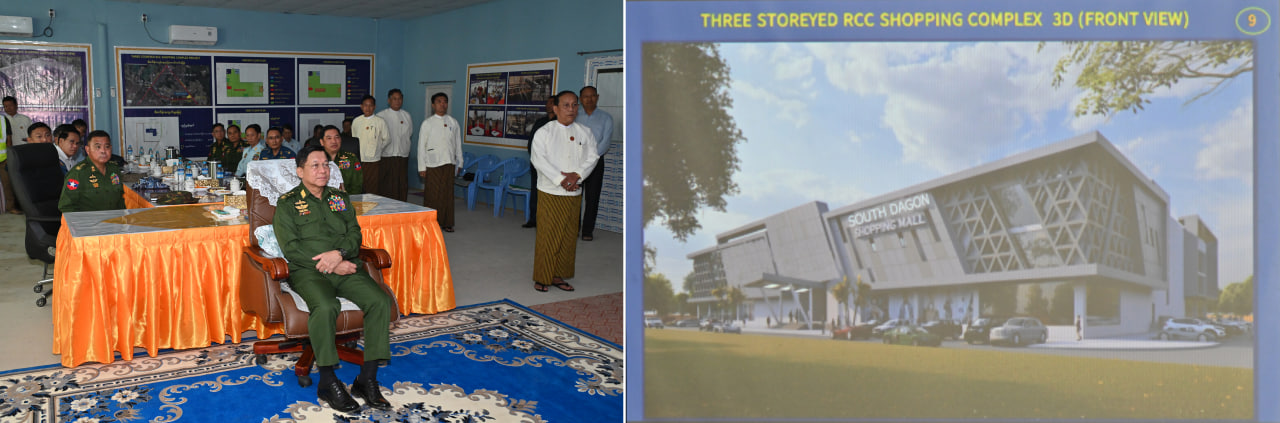 ၎င်းနောက် နိုင်ငံတော်စီမံအုပ်ချုပ်ရေးကောင်စီဥက္ကဋ္ဌ တပ်မတော်ကာကွယ်ရေးဦးစီးချုပ်နှင့် အဖွဲ့ဝင်များသည် မြန်မာ့သားကောင်းအဆင့်မြင့် စစ်မှုထမ်းဟောင်းအိမ်ရာ (လေးထောင့်ကန်) အနီး ဘုရင့်နောင်လမ်းနှင့် အမှတ် (၇) လမ်းထောင့်နေရာတွင် တည်ဆောက်လျက်ရှိသည့် Shopping Complex လုပ်ငန်းခွင်သို့ရောက်ရှိရာ မြန်မာနိုင်ငံစစ်မှုထမ်းဟောင်းအဖွဲ့ ဒုတိယဥက္ကဋ္ဌ (၁) ဒုတိယဗိုလ်ချုပ်ကြီး ရဲအောင် (အငြိမ်းစား) နှင့် တည်ဆောက်ရေးဆိုင်ရာတာဝန်ရှိသူတို့က စီမံကိန်းအကောင်အထည်ပေါ်ပေါက်ခဲ့မှု၊ စီမံကိန်းဆိုင်ရာအချက်အလက်များ၊ ရာနှုန်းပြည့်ပြီးစီးပါက မြင်တွေ့ရမည့်ပုံစံများ၊ အဓိကကျသည့် လုပ်ငန်းကြီးများ ဆောင်ရွက်ပြီးစီးမှုနှင့် သတ်မှတ်ကာလအတွင်း တည်ဆောက်ပြီးစီးမှုရှိစေရေး ဆောင်ရွက်လျက်ရှိမှု အခြေအနေများ၊ လုပ်ငန်းဆောင်ရွက်ခဲ့မှုမှတ်တမ်းများကို ရှင်းလင်းတင်ပြသည်။