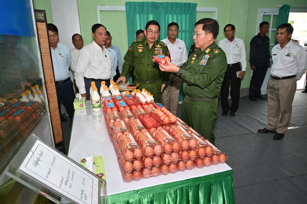 ထို့နောက် နိုင်ငံတော်စီမံအုပ်ချုပ်ရေးကောင်စီဥက္ကဋ္ဌ တပ်မတော်ကာကွယ်ရေးဦးစီးချုပ်နှင့် အဖွဲ့ဝင်များသည် သီလဝါဘက်စုံစိုက်ပျိုးမွေးမြူရေးဇုန်တွင် မွေးမြူထားရှိသည့် ငါး အမျိုးအစားနမူနာပြသထားရှိမှုများနှင့် စိုက်ပျိုးမွေးမြူရေးလုပ်ငန်းများမှ ထွက်ရှိသည့် ကြက်ဥ၊ ဘဲဥ၊ နို့ထွက်ပစ္စည်းများ ခင်းကျင်းပြသထားမှုများကို ကြည့်ရှုသည်။