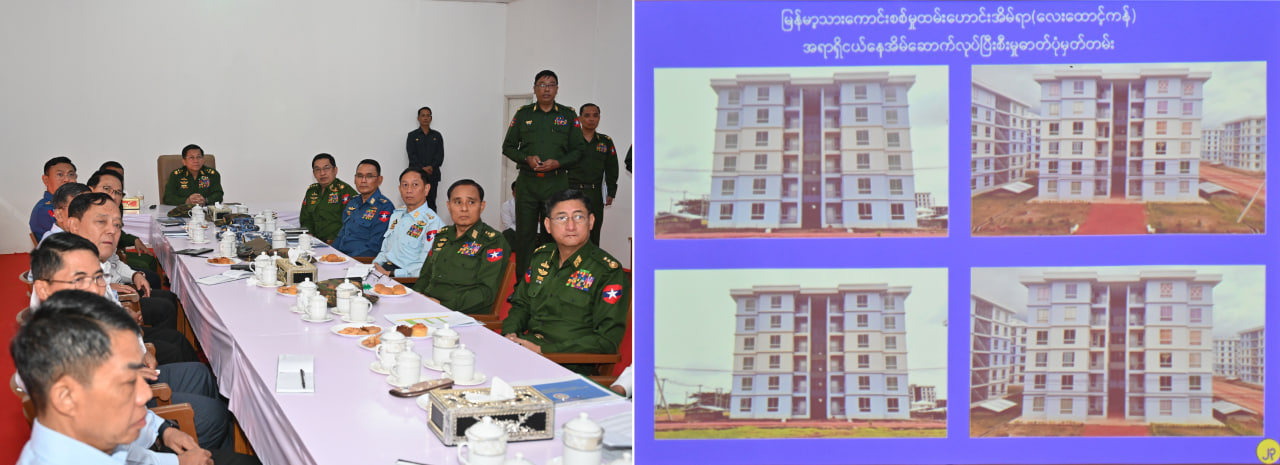 ရှင်းလင်းတင်ပြမှုများအပေါ် နိုင်ငံတော်စီမံအုပ်ချုပ်ရေးကောင်စီဥက္ကဋ္ဌ တပ်မတော်ကာကွယ်ရေးဦးစီးချုပ်က မြန်မာ့သားကောင်းအဆင့်မြင့် စစ်မှုထမ်းဟောင်းအိမ်ရာ (လေးထောင့်ကန်) အား စစ်မှုထမ်းဟောင်းမြို့အဖြစ် တည်ဆောက်နေခြင်းဖြစ်ပြီး ရန်ကုန်မြို့တော်ဖွံ့ဖြိုးရေးအတွက် တစ်ဖက်တစ်လမ်းမှ အထောက်အကူပြုသည့် စံပြုအိမ်ရာ တစ်ခုအဖြစ် ရည်မှန်းဆောင်ရွက်သွားရန်လိုကြောင်း၊ အိမ်ရာအတွင်း လိုအပ်သည့် လျှပ်စစ်ဓာတ်အားရရှိစေရေးအတွက် စီမံကိန်းလိုအပ်ချက်နှင့်ကိုက်ညီသည့် ဆိုလာလျှပ်စစ်ဓာတ်အားထုတ်လုပ်ရေးစီမံကိန်းတစ်ခုကိုလည်း စနစ်တကျတွက်ချက်၍ ထည့်သွင်းဆောင်ရွက်သွားရန်လိုကြောင်း၊ အိမ်ရာများဆောက်လုပ်ရာတွင် မြေကိုအကျိုးရှိရှိနှင့် အကွက်ကျကျအသုံးချနိုင်ရေး စနစ်တကျ တွက်ချက်ဆောင်ရွက်သွားရန်လိုကြောင်း၊ လက်ရှိအချိန်အထိ အိမ်ရာဝန်းတစ်ခုအတွင်း၌ပင် အိမ်ခန်းပေါင်း ၄၀၀၀ ကျော်ကို ဆောင်ရွက်ပေးနိုင်ခဲ့ပြီး မြို့ငယ်တစ်မြို့ကဲ့သို့ဖြစ်လာပြီဖြစ်ပြီဖြစ်၍ လိုအပ်သည်များ ဖြည့်ဆည်းပေးရန်လိုကြောင်းဖြင့်ပြောကြားပြီး အခြားလိုအပ်သည်များကို မှာကြားသည်။