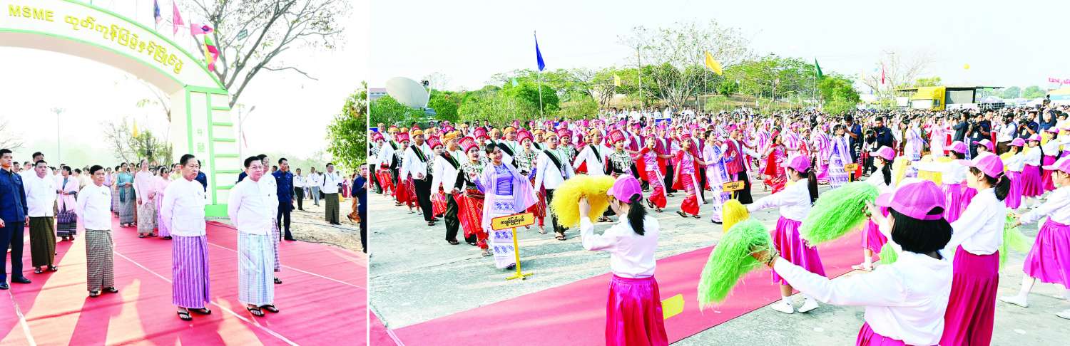 ဦးစွာ အသေးစား၊ အငယ်စားနှင့် အလတ်စား စီးပွားရေးလုပ်ငန်းများ ဖွံ့ဖြိုးတိုးတက်ရေးလုပ်ငန်းကော်မတီဥက္ကဋ္ဌ နိုင်ငံတော်စီမံအုပ်ချုပ်ရေးကောင်စီ ဒုတိယဥက္ကဋ္ဌ ဒုတိယဝန်ကြီးချုပ် ဒုတိယဗိုလ်ချုပ်မှူးကြီး စိုးဝင်း၊ ပြည်ထောင်စုဝန်ကြီးများဖြစ်ကြသည့် ဦးဝင်းရှိန်၊ ဦးမင်းနောင်၊ ဦးလှမိုး၊ ဒေါက်တာ ချာလီသန်း၊ ဒေါက်တာ မျိုးသိန်းကျော်တို့နှင့် နေပြည်တော်ကောင်စီဥက္ကဋ္ဌ ဦးသန်းထွန်းဦးတို့က ပြည်ထောင်စုအဆင့် MSME ထုတ်ကုန်ပြပွဲနှင့်ပြိုင်ပွဲ ဖွင့်ပွဲအခမ်းအနားကို ဖဲကြိုးဖြတ်ဖွင့်လှစ်ပေးကြသည်။