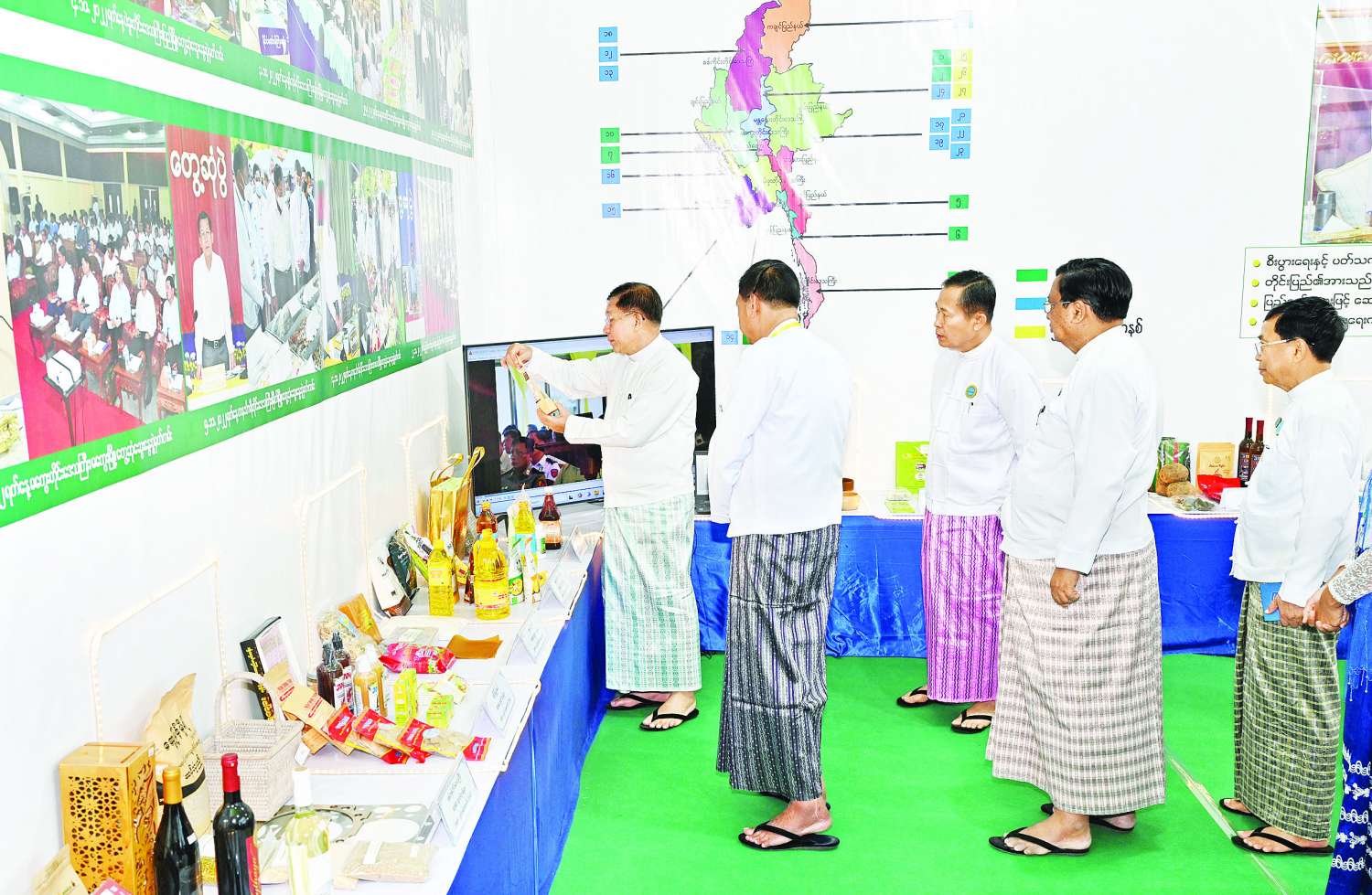 ဖွင့်ပွဲအခမ်းအနားအပြီးတွင် နိုင်ငံတော်စီမံအုပ်ချုပ်ရေးကောင်စီဥက္ကဋ္ဌ နိုင်ငံတော်ဝန်ကြီးချုပ်သည် အဖွဲ့ဝင်များနှင့်အတူ စက်မှုဝန်ကြီးဌာနပြခန်း၊ စိုက်ပျိုးရေး၊ မွေးမြူရေးနှင့်ဆည်မြောင်းဝန်ကြီးဌာနပြခန်း၊ သမဝါယမနှင့်ကျေးလက်ဖွံ့ဖြိုးရေးဝန်ကြီး ဌာနပြခန်း၊ သယံဇာတနှင့်သဘာဝပတ်ဝန်းကျင်ထိန်းသိမ်းရေးဝန်ကြီးဌာနပြခန်း၊ စီးပွားရေးနှင့်ကူးသန်းရောင်းဝယ်ရေးဝန်ကြီးဌာနပြခန်း၊ သိပ္ပံနှင့်နည်းပညာဝန်ကြီးဌာနပြခန်း၊ ကျန်းမာရေးဝန်ကြီးဌာနပြခန်း၊ ပြည်ထောင်စုနယ်မြေ နေပြည်တော် MSME ထုတ်ကုန်ပြခန်း၊ ကချင်ပြည်နယ် MSME ထုတ်ကုန်ပြခန်း၊ ကယားပြည်နယ် MSME ထုတ်ကုန်ပြခန်း၊ ကရင်ပြည်နယ် MSME ထုတ်ကုန်ပြခန်း၊ ချင်းပြည်နယ် MSME ထုတ်ကုန်ပြခန်း၊ စစ်ကိုင်းတိုင်းဒေသကြီး MSME ထုတ်ကုန်ပြခန်း၊ တနင်္သာရီတိုင်းဒေသကြီး MSME ထုတ်ကုန်ပြခန်း၊ ပဲခူးတိုင်းဒေသကြီး MSME ထုတ်ကုန်ပြခန်း၊ မကွေးတိုင်းဒေသကြီး MSME ထုတ်ကုန်ပြခန်း၊ မွန်ပြည်နယ် MSME ထုတ်ကုန်ပြခန်း၊ ရခိုင်ပြည်နယ် MSME ထုတ်ကုန်ပြခန်း၊ ရန်ကုန်တိုင်းဒေသကြီး MSME ထုတ်ကုန်ပြခန်း၊ ရှမ်းပြည်နယ် MSME ထုတ်ကုန်ပြခန်း၊ ဧရာဝတီတိုင်းဒေသကြီး MSME ထုတ်ကုန်ပြခန်းတို့အား ပြခန်းတစ်ခုချင်းစီအလိုက် စိတ်ပါဝင်စားစွာဖြင့် လိုက်လံကြည့်ရှုပြီး ထုတ်ကုန်များအလိုက် လုပ်ငန်းဆောင်ရွက်မှုများ၊ ကုန်ကြမ်းရရှိမှုနှင့် သုံးစွဲမှု၊ ထုတ်ကုန်များထုတ်လုပ်မှု၊ ပြည်တွင်း၊ ပြည်ပ ဈေးကွက်ရရှိမှုအခြေအနေများ၊ လုပ်ငန်းလိုအပ်ချက်များနှင့် ပြည်တွင်း၊ ပြည်ပသို့ ပိုမိုတိုးချဲ့ဖြန့်ဖြူးနိုင်မည့်အခြေအနေများနှင့် သိရှိလိုသည်များမေးမြန်းဆွေးနွေးပြီး လိုအပ်သည်များကို တာဝန်ရှိသူများနှင့် ပေါင်းစပ်ညှိနှိုင်းဖြည့်ဆည်းဆောင်ရွက်ပေးကာ ကြည့်ရှုမှုများကို ခေတ္တရပ်နားသည်။
