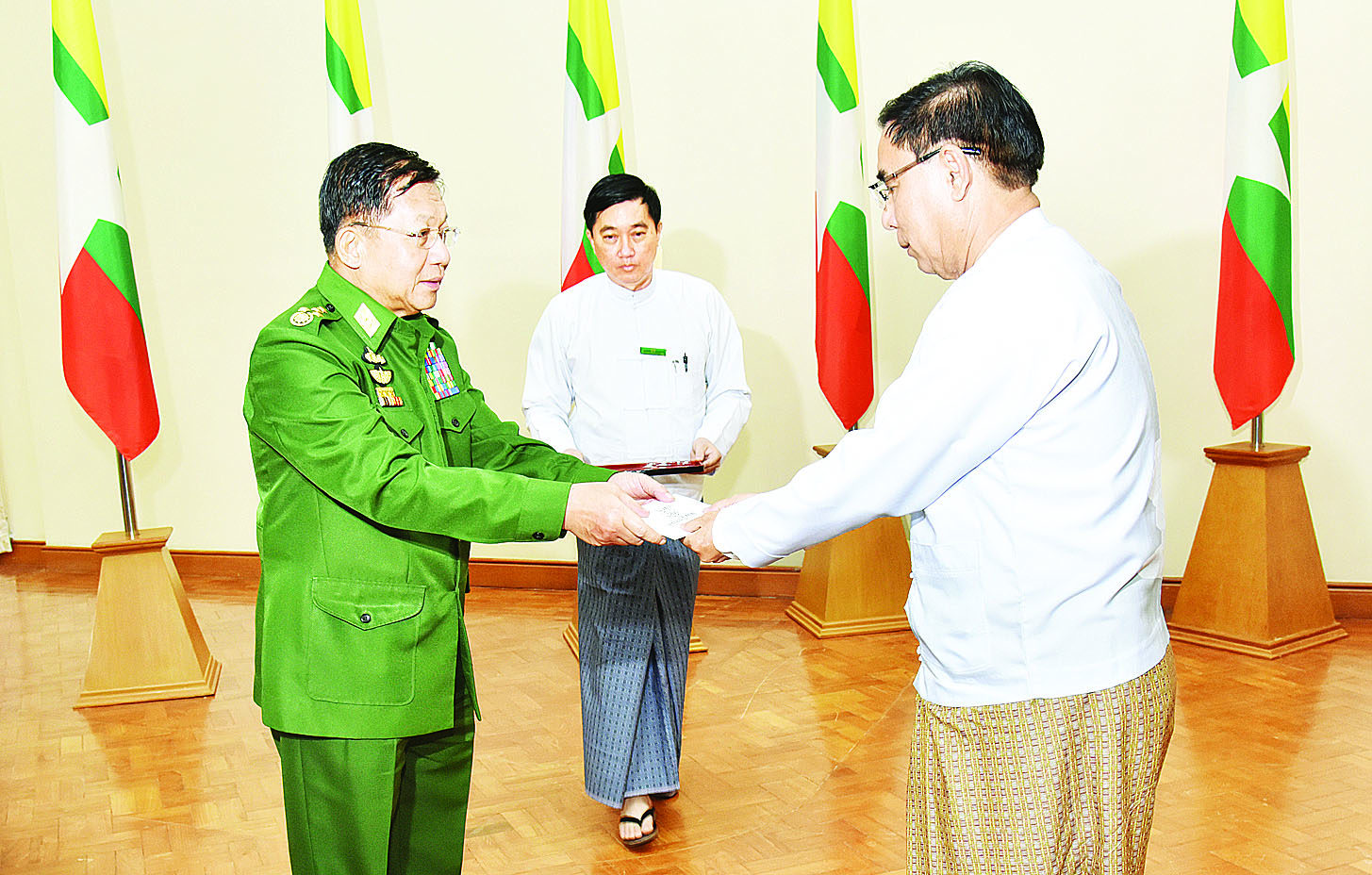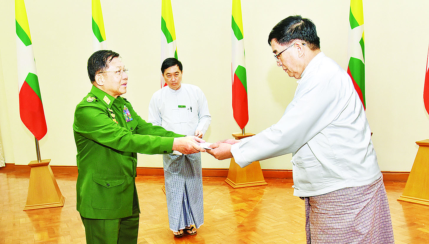 ထို့နောက် နိုင်ငံတော်စီမံအုပ်ချုပ်ရေးကောင်စီဥက္ကဋ္ဌ နိုင်ငံတော်ဝန်ကြီးချုပ်က အကြမ်းဖက်ဖြစ်စဉ်များကြောင့် ယာယီနေရပ်စွန့်ခွာနေရသည့် ပြည်သူများအတွက် ထောက်ပံ့ငွေများကိုပေးအပ်ရာ နေပြည်တော်ကောင်စီအပါအဝင် တိုင်းဒေသကြီးနှင့် ပြည်နယ်ဝန်ကြီးချုပ်များက အသီးသီးလက်ခံရယူကြသည်။